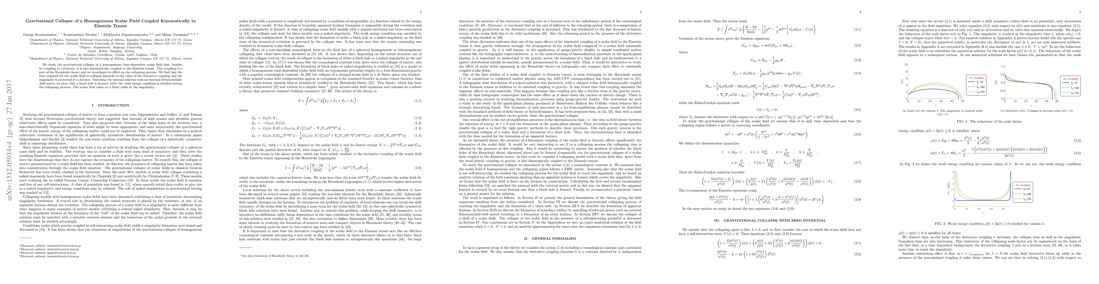 This paper investigates the gravitational collapse of a homogeneous scalar field with a kinematic coupling to the Einstein tensor, part of Horndeski theory, and finds that the collapse time depends on the derivative coupling. The singularity is protected by a horizon, and a black hole forms while satisfying the weak energy condition, with the scalar field reaching a finite value at the singularity.