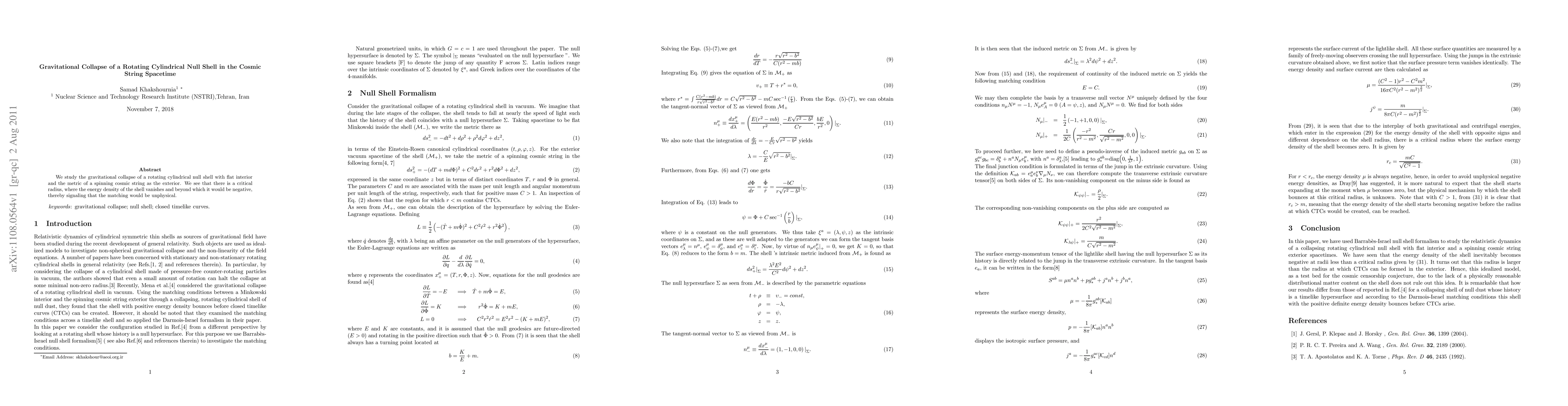 The paper presents a detailed analysis of the gravitational collapse of a rotating cylindrical null shell in cosmic string spacetime, identifying a critical radius where the shell's energy density becomes negative.