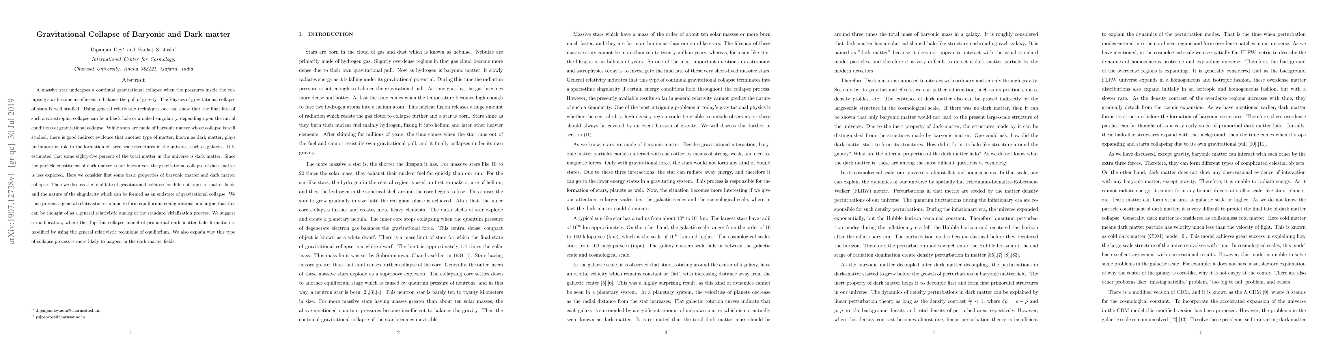 This paper explores the gravitational collapse of baryonic and dark matter, examining the final fates of such collapses, including the formation of black holes or naked singularities. It proposes a general relativistic technique to form equilibrium configurations, suggesting a modified Top-Hat collapse model for primordial dark matter halo formation.