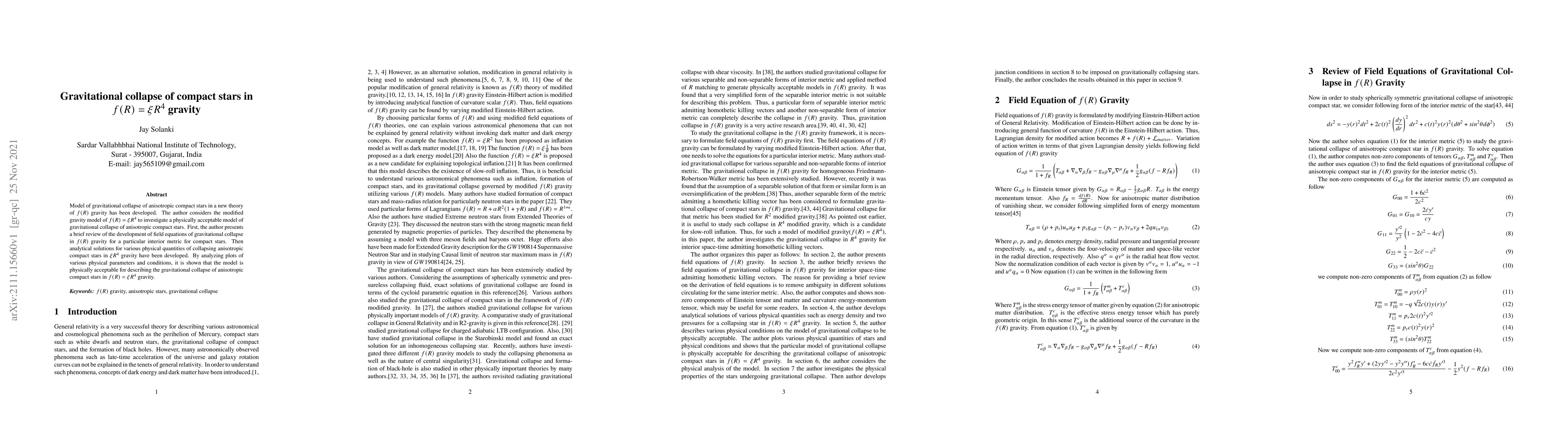 This paper develops a model for the gravitational collapse of anisotropic compact stars using $f(R) = \xi R^4$ gravity. Analytical solutions are derived and shown to provide a physically acceptable description of the collapse.