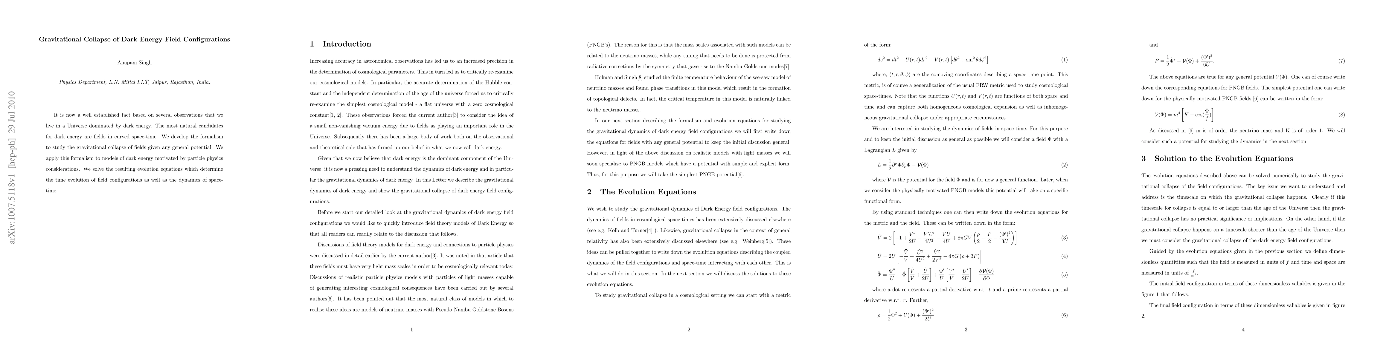 This paper develops a formalism to study the gravitational collapse of dark energy fields in curved space-time, applying it to particle physics-motivated models and solving the resulting equations to determine the time evolution and dynamics of the fields and spacetime.