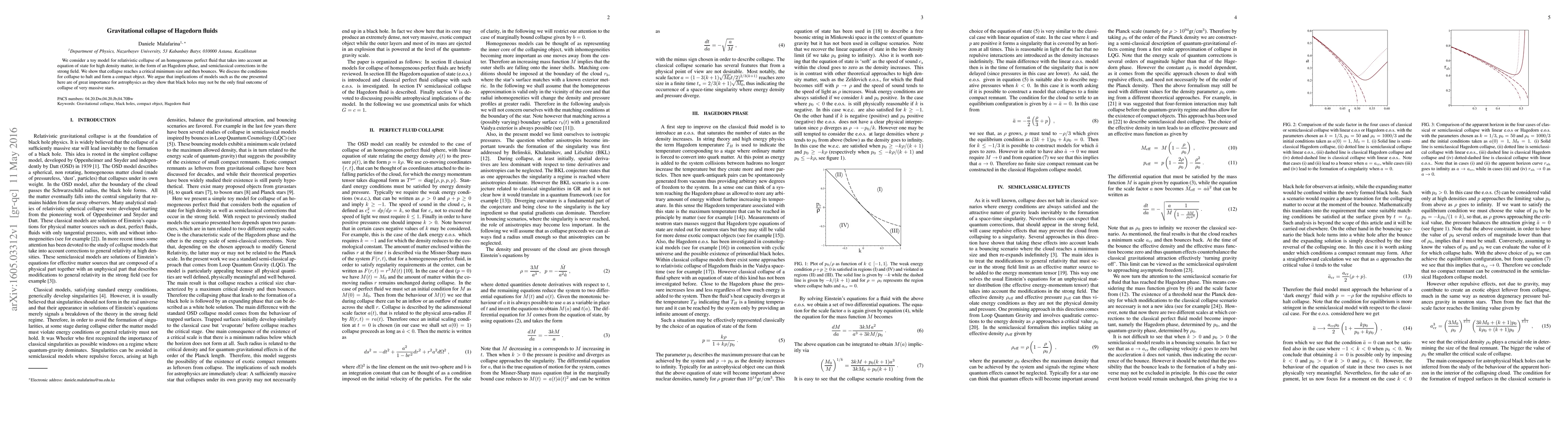 We consider a toy model for relativistic collapse of an homogeneous perfect fluid that takes into account an equation of state for high density matter, in the form of an Hagedorn phase, and semiclassical corrections in the strong field. We show that collapse reaches a critical minimum size and then bounces. We discuss the conditions for collapse to halt and form a compact object. We argue that implications of models such as the one presented here are of great importance for astrophysics as they show that black holes may not be the only final outcome of collapse of very massive stars.