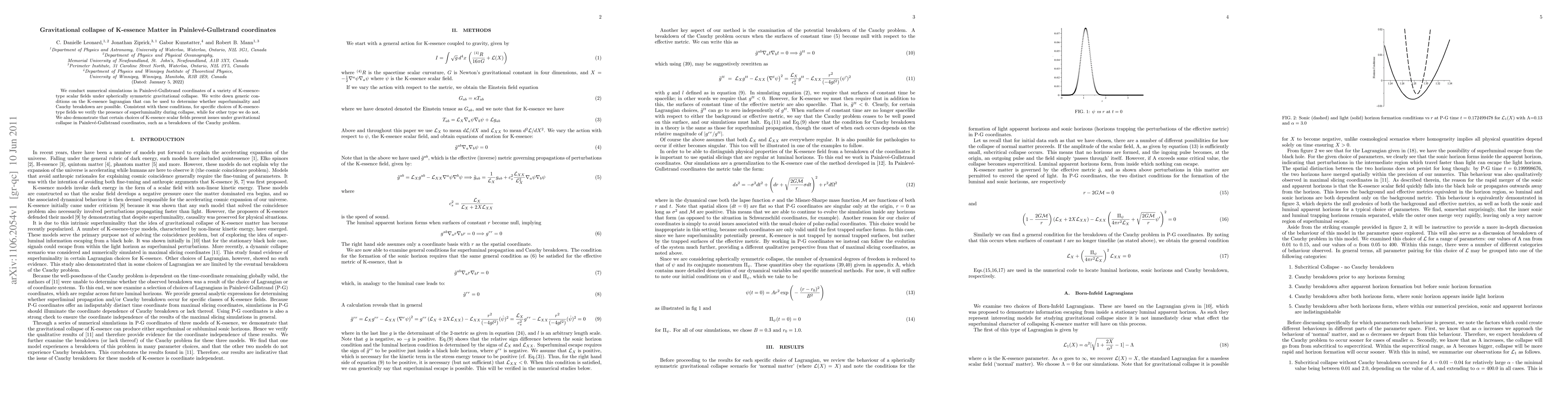 This paper investigates the gravitational collapse of K-essence matter using numerical simulations in Painlevé-Gullstrand coordinates, identifying conditions for superluminality and Cauchy breakdown. It finds specific K-essence fields exhibit superluminality, while others lead to a breakdown of the Cauchy problem.