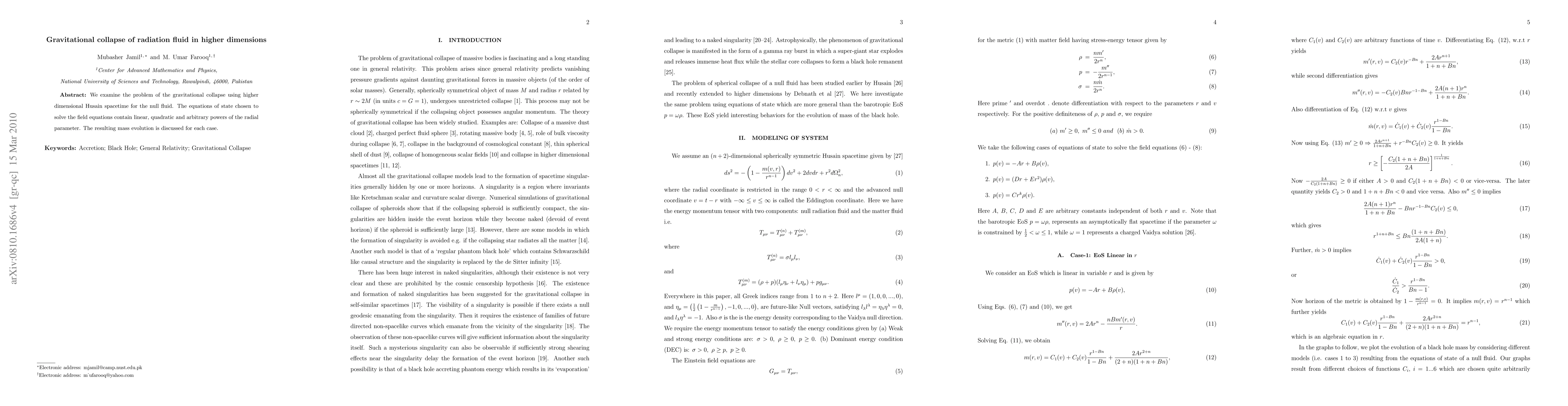 We examine the problem of the gravitational collapse using higher dimensional Husain spacetime for the null fluid. The equations of state chosen to solve the field equations contain linear, quadratic and arbitrary powers of the radial parameter. The resulting mass evolution is discussed for each case.