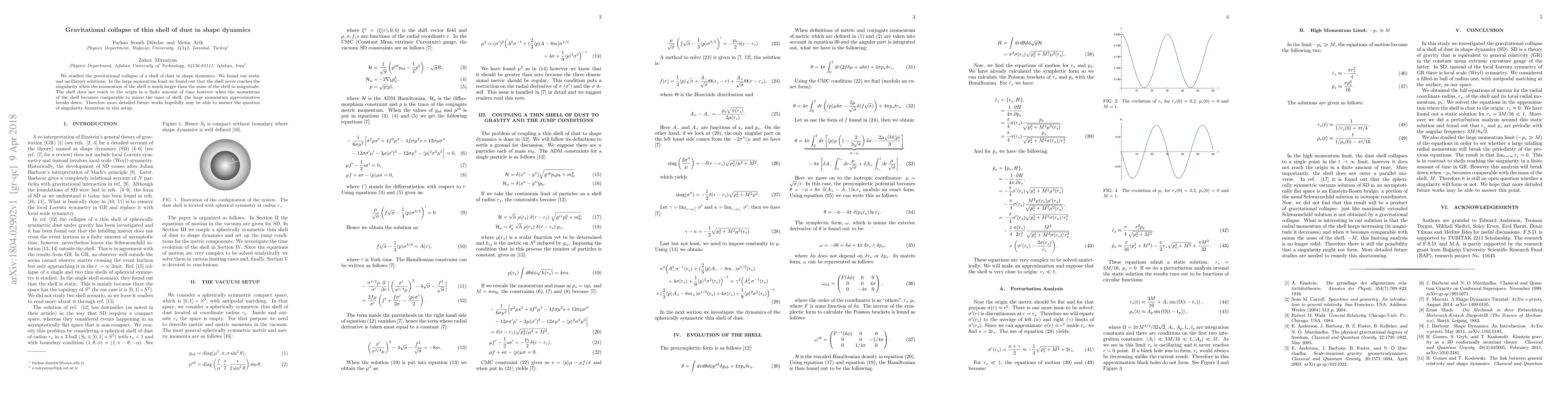 This paper investigates the gravitational collapse of a dust shell in the framework of shape dynamics, revealing static and oscillatory solutions. The study finds that in the large momentum limit, the shell avoids singularity formation, but when momentum approaches the mass magnitude, the approximation fails, necessitating further research to determine singularity formation.