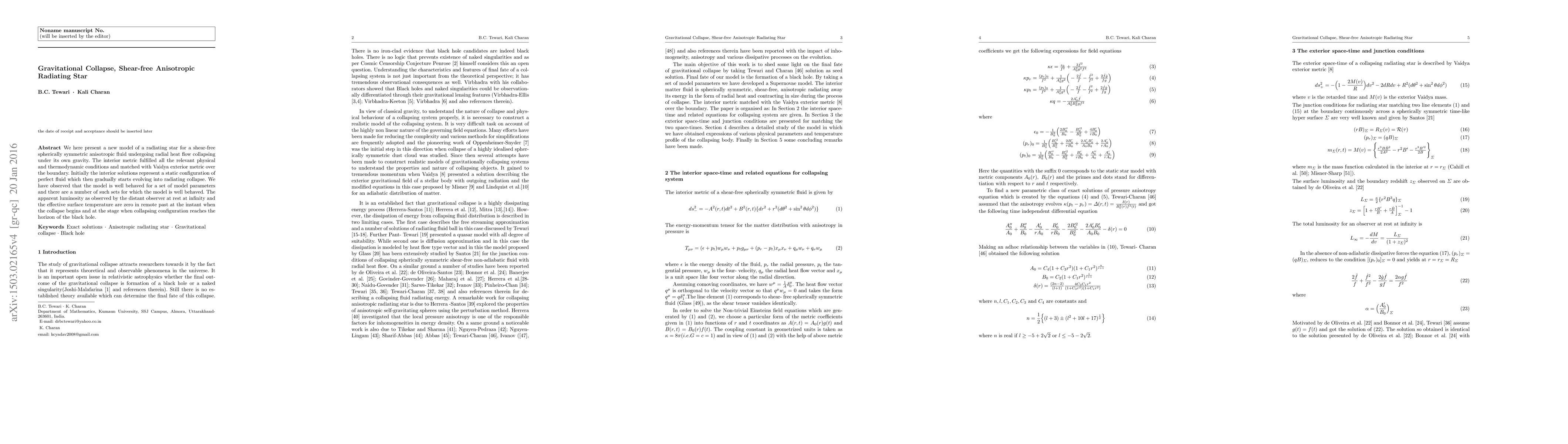 This paper presents exact solutions to Einstein's field equations for a shear-free, anisotropic radiating star undergoing gravitational collapse. The solutions match the Vaidya exterior metric and describe a static, dissipative fluid that evolves into radiating collapse, with zero luminosity and surface temperature at the beginning and end of the collapse.