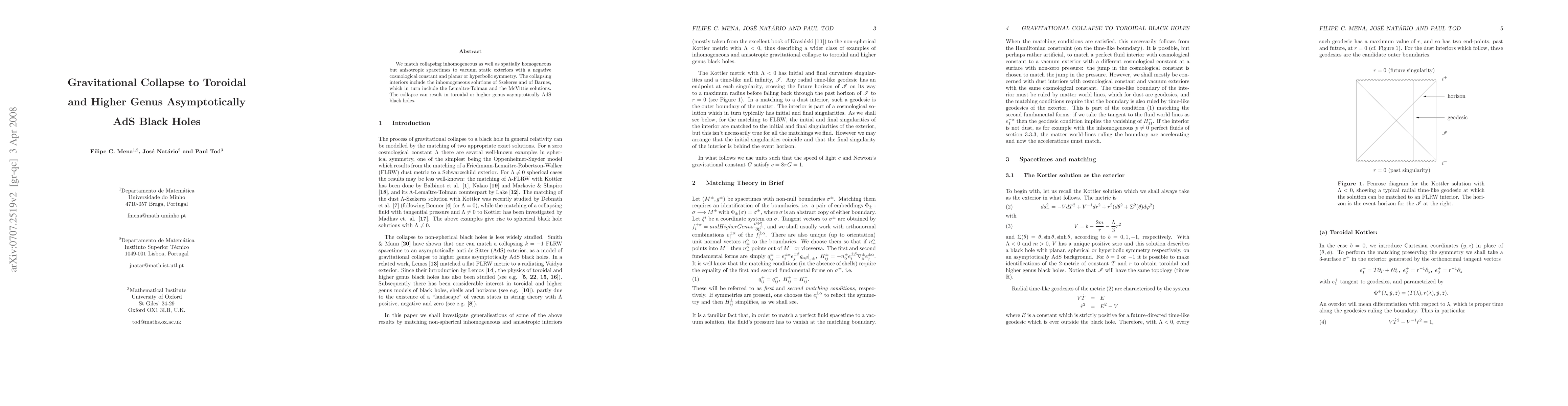 This paper studies the gravitational collapse to toroidal and higher genus asymptotically AdS black holes, matching inhomogeneous and anisotropic spacetimes to vacuum static exteriors with planar or hyperbolic symmetry. The resulting black holes emerge from solutions like Szekeres, Lemaitre-Tolman, and McVittie.