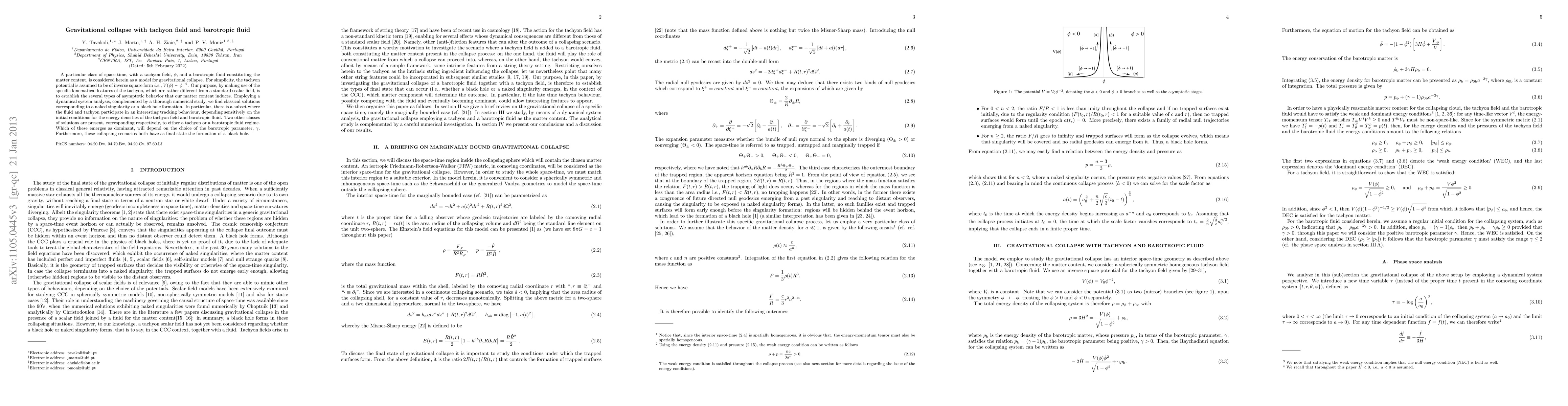 A particular class of space-time, with a tachyon field, \phi, and a barotropic fluid constituting the matter content, is considered herein as a model for gravitational collapse. For simplicity, the tachyon potential is assumed to be of inverse square form i.e., V(\phi) \sim \phi^{-2}. Our purpose, by making use of the specific kinematical features of the tachyon, which are rather different from a standard scalar field, is to establish the several types of asymptotic behavior that our matter content induces. Employing a dynamical system analysis, complemented by a thorough numerical study, we find classical solutions corresponding to a naked singularity or a black hole formation. In particular, there is a subset where the fluid and tachyon participate in an interesting tracking behaviour, depending sensitively on the initial conditions for the energy densities of the tachyon field and barotropic fluid. Two other classes of solutions are present, corresponding respectively, to either a tachyon or a barotropic fluid regime. Which of these emerges as dominant, will depend on the choice of the barotropic parameter, \gamma. Furthermore, these collapsing scenarios both have as final state the formation of a black hole.