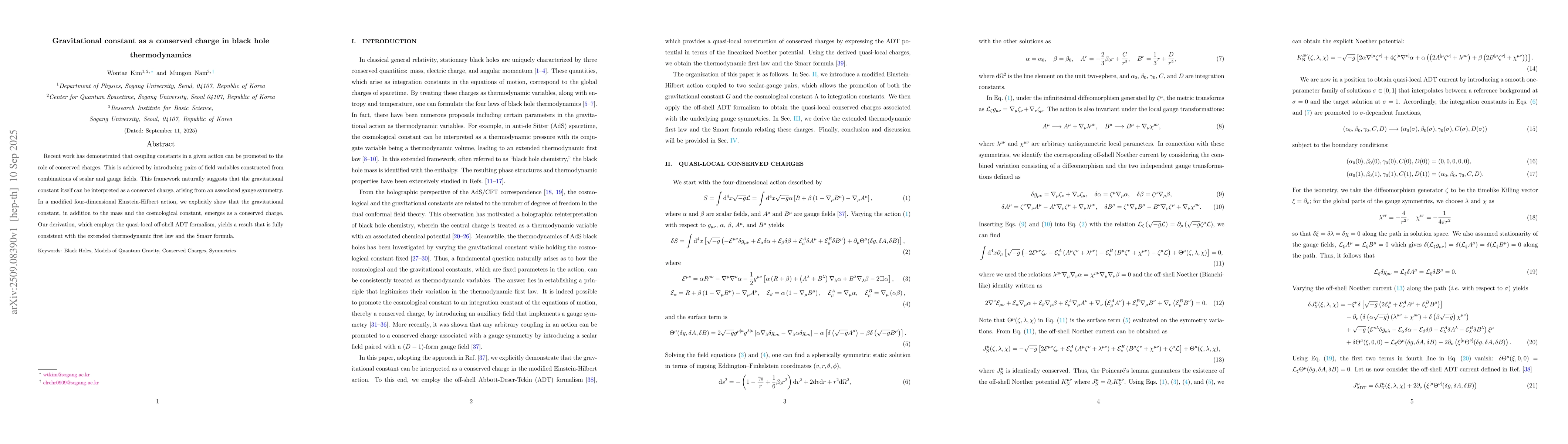 Recent work has demonstrated that coupling constants in a given action can be promoted to the role of conserved charges. This is achieved by introducing pairs of field variables constructed from combinations of scalar and gauge fields. This framework naturally suggests that the gravitational constant itself can be interpreted as a conserved charge, arising from an associated gauge symmetry. In a modified four-dimensional Einstein-Hilbert action, we explicitly show that the gravitational constant, in addition to the mass and the cosmological constant, emerges as a conserved charge. Our derivation, which employs the quasi-local off-shell ADT formalism, yields a result that is fully consistent with the extended thermodynamic first law and the Smarr formula.
