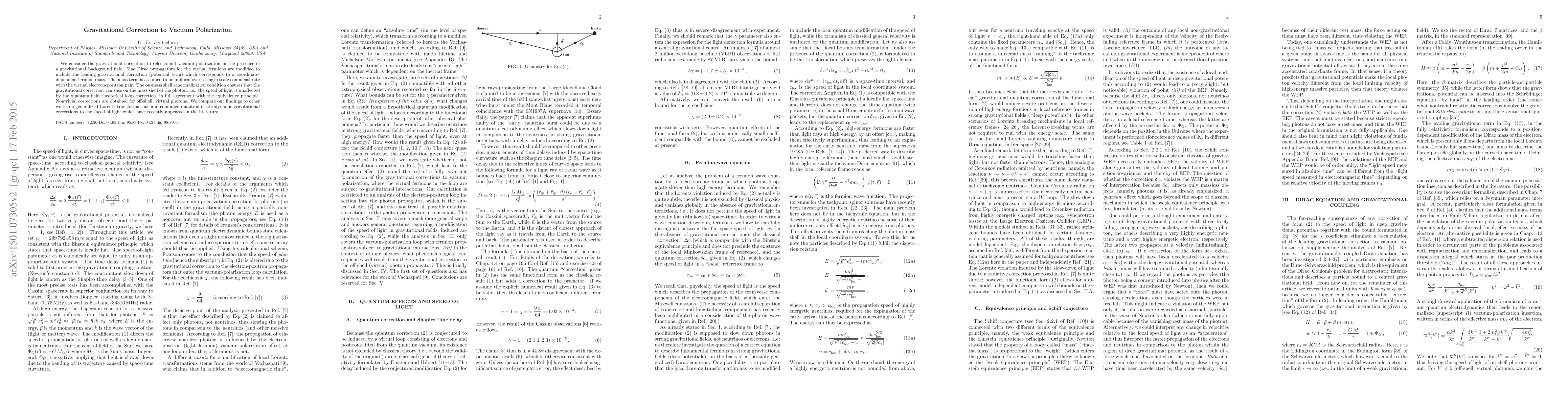 We consider the gravitational correction to (electronic) vacuum polarization in the presence of a gravitational background field. The Dirac propagators for the virtual fermions are modified to include the leading gravitational correction (potential term) which corresponds to a coordinate-dependent fermion mass. The mass term is assumed to be uniform over a length scale commensurate with the virtual electron-positron pair. The on-mass shell renormalization condition ensures that the gravitational correction vanishes on the mass shell of the photon, i.e., the speed of light is unaffected by the quantum field theoretical loop correction, in full agreement with the equivalence principle. Nontrivial corrections are obtained for off-shell, virtual photons. We compare our findings to other works on generalized Lorentz transformations and combined quantum-electrodynamic gravitational corrections to the speed of light which have recently appeared in the literature.
