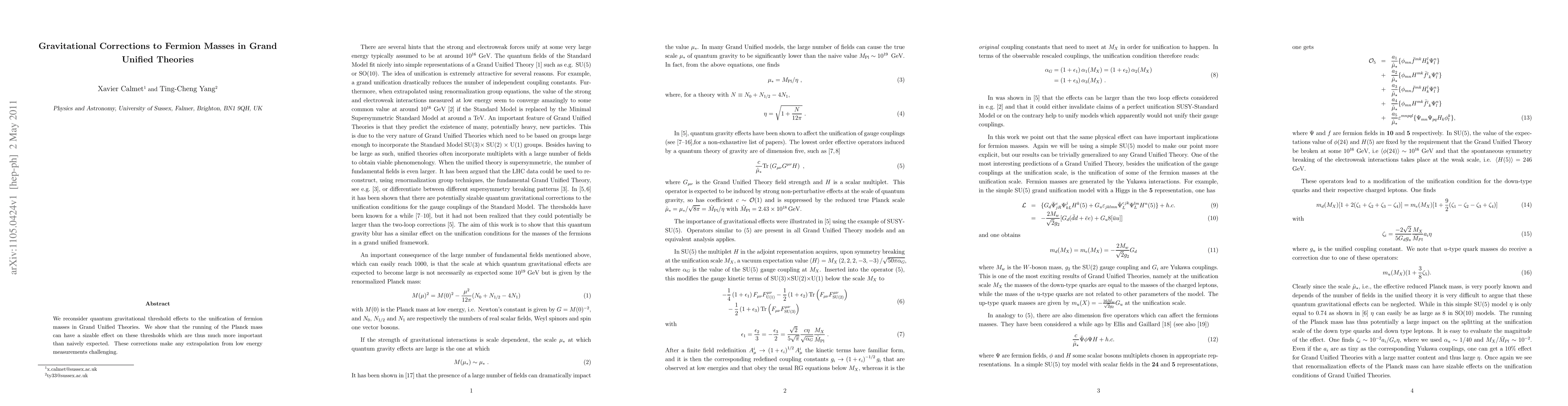 This paper examines quantum gravitational threshold effects on fermion masses in Grand Unified Theories, demonstrating that the running of the Planck mass significantly influences these thresholds, complicating low-energy extrapolations.