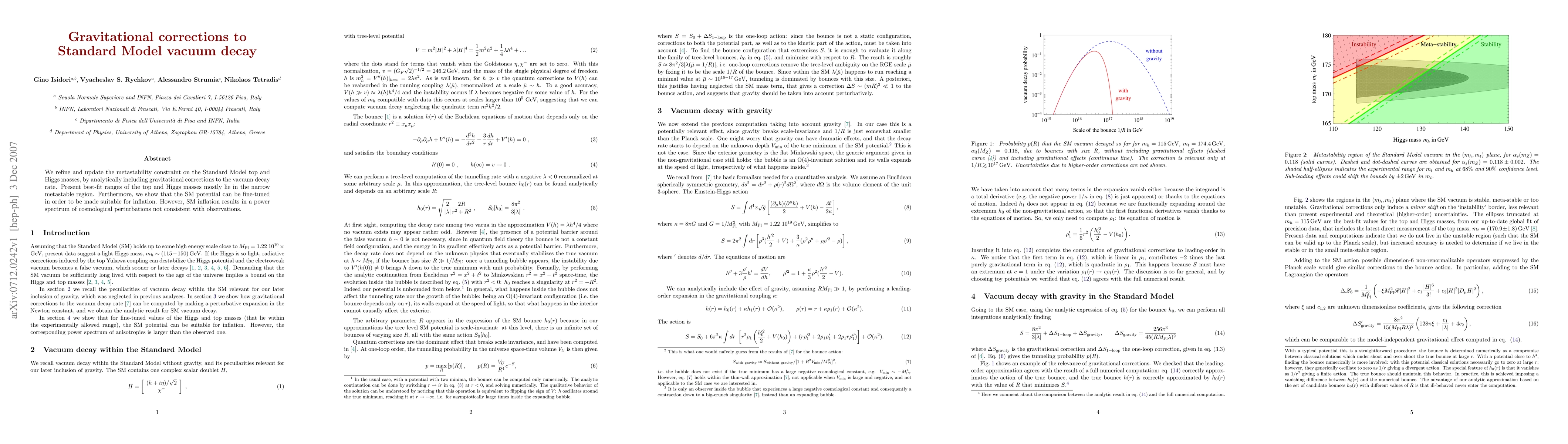 This paper refines the metastability constraint on the Standard Model's top and Higgs masses by incorporating gravitational corrections to the vacuum decay rate, revealing that current best-fit mass ranges lie in a metastable region. It also discusses the potential for Standard Model inflation, though concludes it leads to a power spectrum inconsistent with observational data.