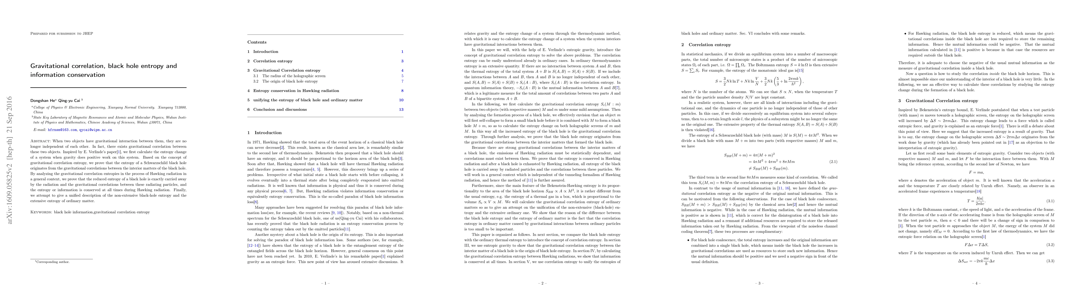 This paper explores gravitational correlation and its role in black hole entropy and information conservation. It demonstrates that black hole entropy arises from gravitational correlations within the black hole and shows that entropy and information are conserved during Hawking radiation through these correlations.