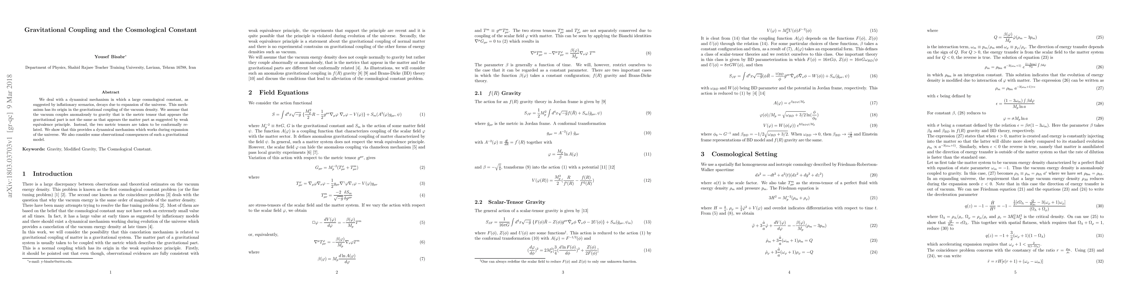 We deal with a dynamical mechanism in which a large cosmological constant, as suggested by inflationary scenarios, decays due to expansion of the universe. This mechanism has its origin in the gravitational coupling of the vacuum density. We assume that the vacuum couples anomalously to gravity that is the metric tensor that appears the gravitational part is not the same as that appears the matter part as suggested by weak equivalence principle. Instead, the two metric tensors are taken to be conformally related. We show that this provides a dynamical mechanism which works during expansion of the universe. We also consider some observational consequences of such a gravitational model.