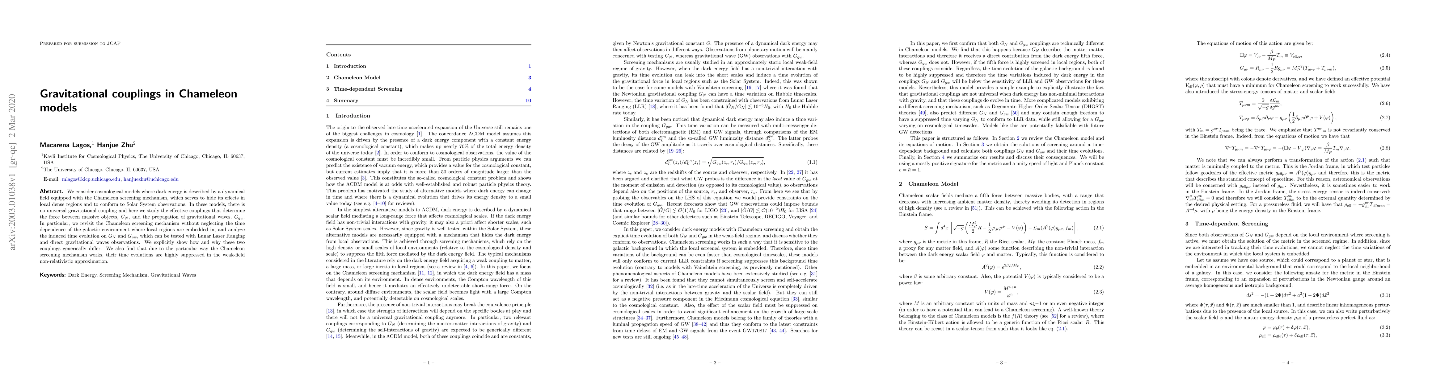 We consider cosmological models where dark energy is described by a dynamical field equipped with the Chameleon screening mechanism, which serves to hide its effects in local dense regions and to conform to Solar System observations. In these models, there is no universal gravitational coupling and here we study the effective couplings that determine the force between massive objects, $G_N$, and the propagation of gravitational waves, $G_{gw}$. In particular, we revisit the Chameleon screening mechanism without neglecting the time dependence of the galactic environment where local regions are embedded in, and analyze the induced time evolution on $G_N$ and $G_{gw}$, which can be tested with Lunar Laser Ranging and direct gravitational waves observations. We explicitly show how and why these two couplings generically differ. We also find that due to the particular way the Chameleon screening mechanism works, their time evolutions are highly suppressed in the weak-field non-relativistic approximation.