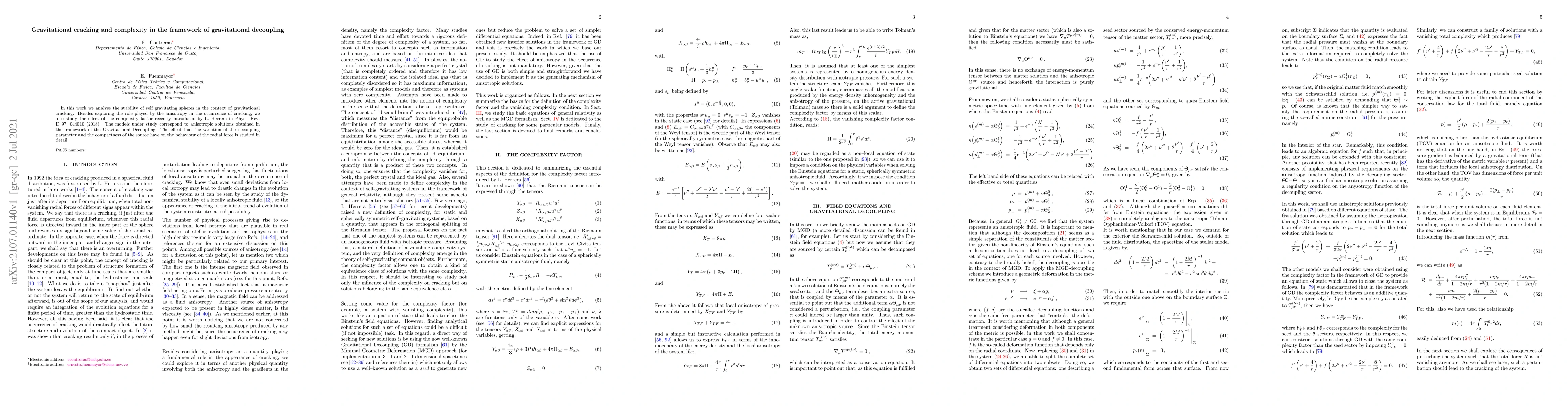 This paper investigates the stability of self-gravitating spheres in gravitational cracking, focusing on the role of anisotropy and the complexity factor introduced by L. Herrera. It examines how variations in the decoupling parameter and source compactness influence the radial force behavior within gravitational decoupling frameworks.