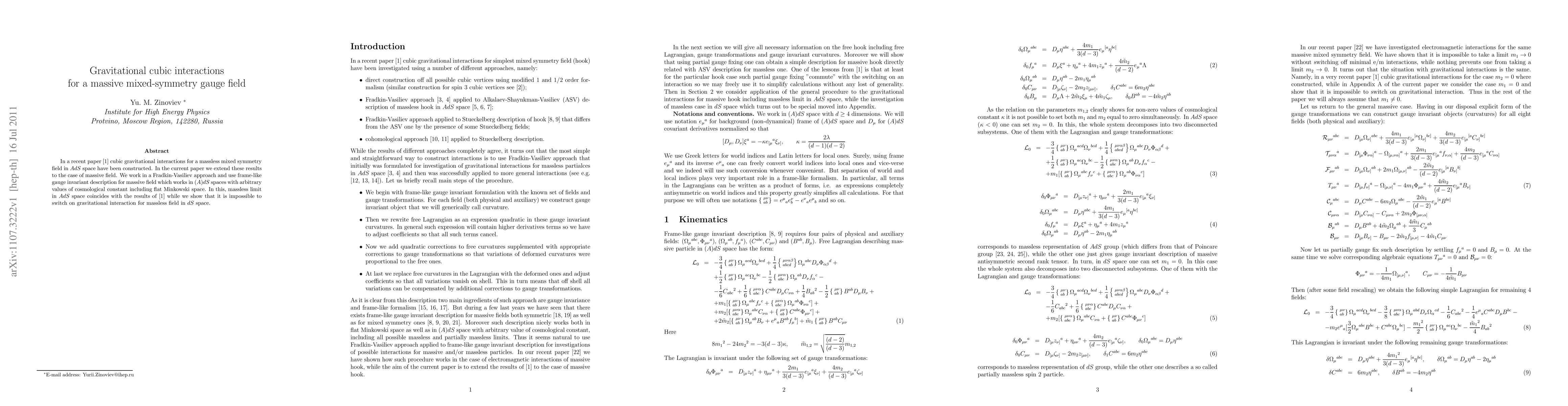 In a recent paper arXiv:1107.1872 cubic gravitational interactions for a massless mixed symmetry field in AdS space have been constructed. In the current paper we extend these results to the case of massive field. We work in a Fradkin-Vasiliev approach and use frame-like gauge invariant description for massive field which works in (A)dS spaces with arbitrary values of cosmological constant including flat Minkowski space. In this, massless limit in AdS space coincides with the results of arXiv:1107.1872 while we show that it is impossible to switch on gravitational interaction for massless field in dS space.