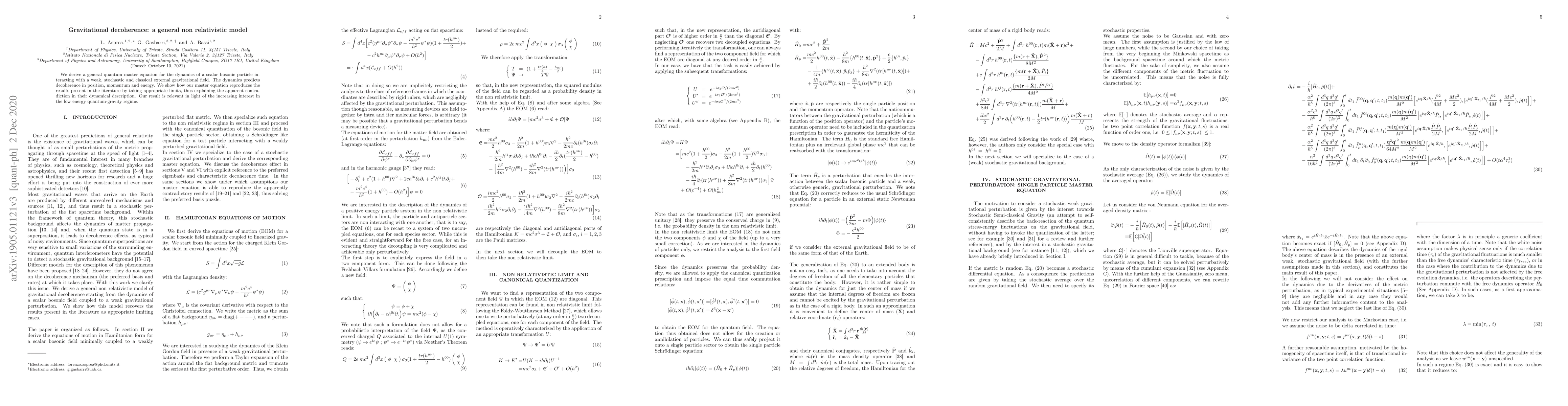 This paper introduces a general quantum master equation for gravitational decoherence in scalar bosonic particles, resolving apparent contradictions in existing literature and providing insight into the low-energy quantum-gravity regime.