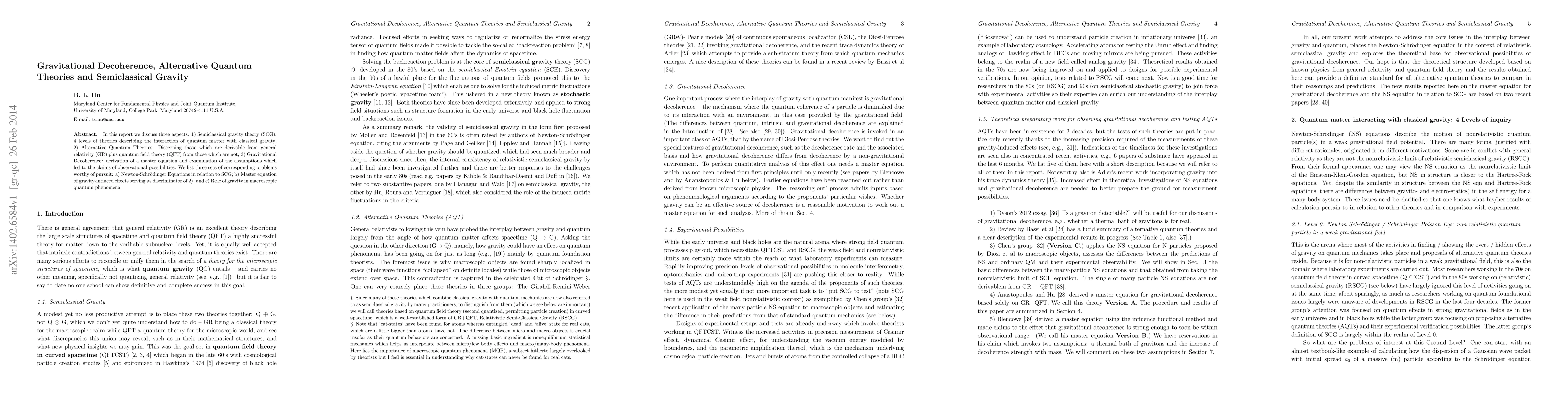 In this report we discuss three aspects: 1) Semiclassical gravity theory (SCG): 4 levels of theories describing the interaction of quantum matter with classical gravity; 2) Alternative Quantum Theories: Discerning those which are derivable from general relativity (GR) plus quantum field theory (QFT) from those which are not; 3) Gravitational Decoherence: Derivation of a master equation and examination of the assumptions which led to the claims of observational possibilities. We list three sets of corresponding problems worthy of pursuit: a) Newton-Schr\"odinger Equations in relation to SCG; b) Master equation of gravity-induced effects serving as discriminator of 2); and c) Role of gravity in macroscopic quantum phenomena.