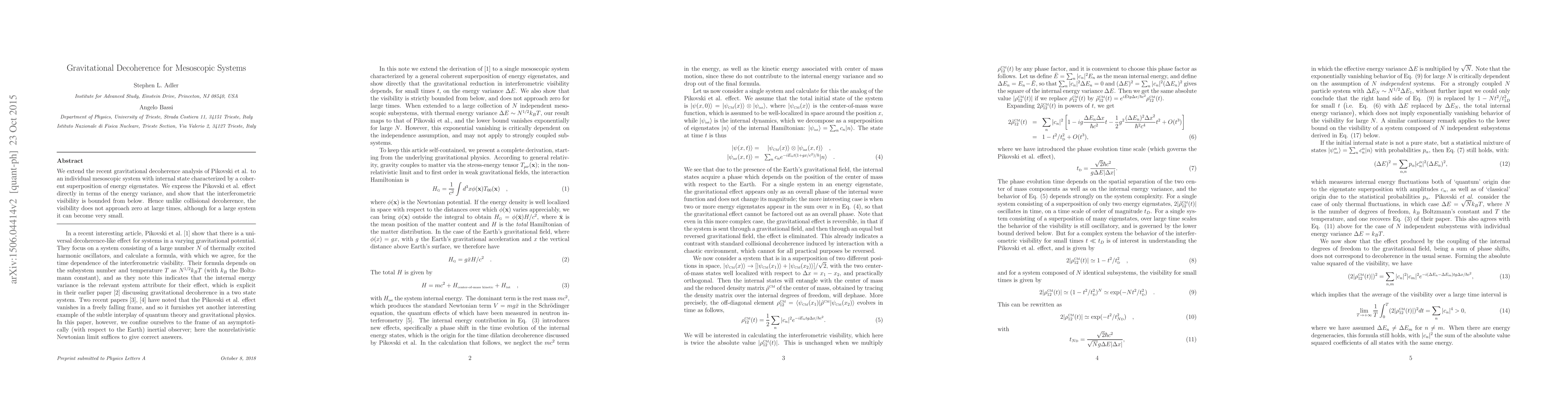 This paper extends the gravitational decoherence framework to mesoscopic systems, showing that interferometric visibility remains bounded and does not vanish at large times, unlike collisional decoherence, due to the energy variance of the system's coherent superposition of energy eigenstates.