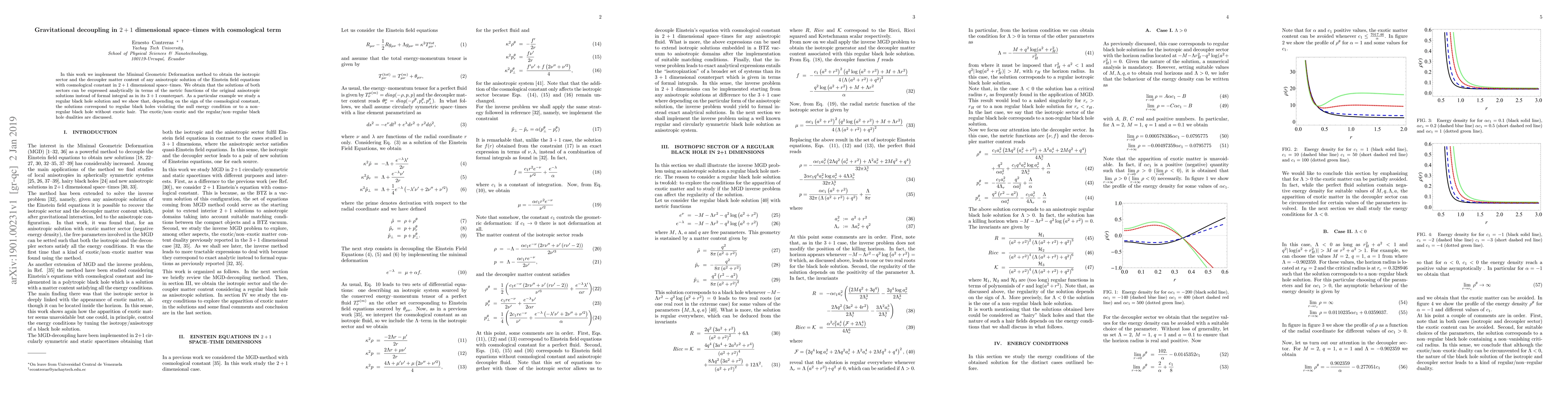 In this work we implement the Minimal Geometric Deformation method to obtain the isotropic sector and the decoupler matter content of any anisotropic solution of the Einstein field equations with cosmological constant in $2+1$ dimensional space--times. We obtain that the solutions of both sectors can be expressed analytically in terms of the metric functions of the original anisotropic solutions instead of formal integral as in its $3+1$ counterpart. As a particular example we study a regular black hole solution and we show that, depending on the sign of the cosmological constant, the solutions correspond to regular black holes violating the null energy condition or to a non--regular black hole without exotic hair. The exotic/non--exotic and the regular/non--regular black hole dualities are discussed.