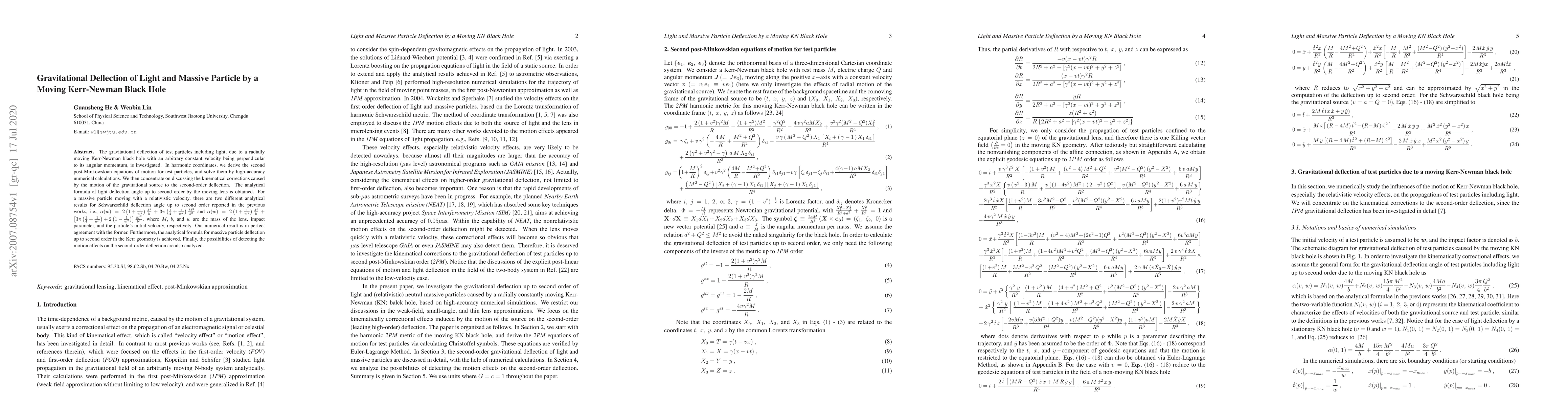 The gravitational deflection of test particles including light, due to a radially moving Kerr-Newman black hole with an arbitrary constant velocity being perpendicular to its angular momentum, is investigated. In harmonic coordinates, we derive the second post-Minkowskian equations of motion for test particles, and solve them by high-accuracy numerical calculations. We then concentrate on discussing the kinematical corrections caused by the motion of the gravitational source to the second-order deflection. The analytical formula of light deflection angle up to second order by the moving lens is obtained. For a massive particle moving with a relativistic velocity, there are two different analytical results for Schwarzschild deflection angle up to second order reported in the previous works, i.e., $\alpha(w)=2\left(1+\frac{1}{w^2}\right)\frac{M}{b}+3\pi\left(\frac{1}{4}+\frac{1}{w^2}\right)\frac{M^2}{b^2}$ and $\alpha(w)=2\left(1+\frac{1}{w^2}\right)\frac{M}{b}+\left[3\pi\left(\frac{1}{4}+\frac{1}{w^2}\right)+2\left(1-\frac{1}{w^4}\right)\right]\frac{M^2}{b^2}$, where $M,$ $b,$ and $w$ are the mass of the lens, impact parameter, and the particle's initial velocity, respectively. Our numerical result is in perfect agreement with the former. Furthermore, the analytical formula for massive particle deflection up to second order in the Kerr geometry is achieved. Finally, the possibilities of detecting the motion effects on the second-order deflection are also analyzed.