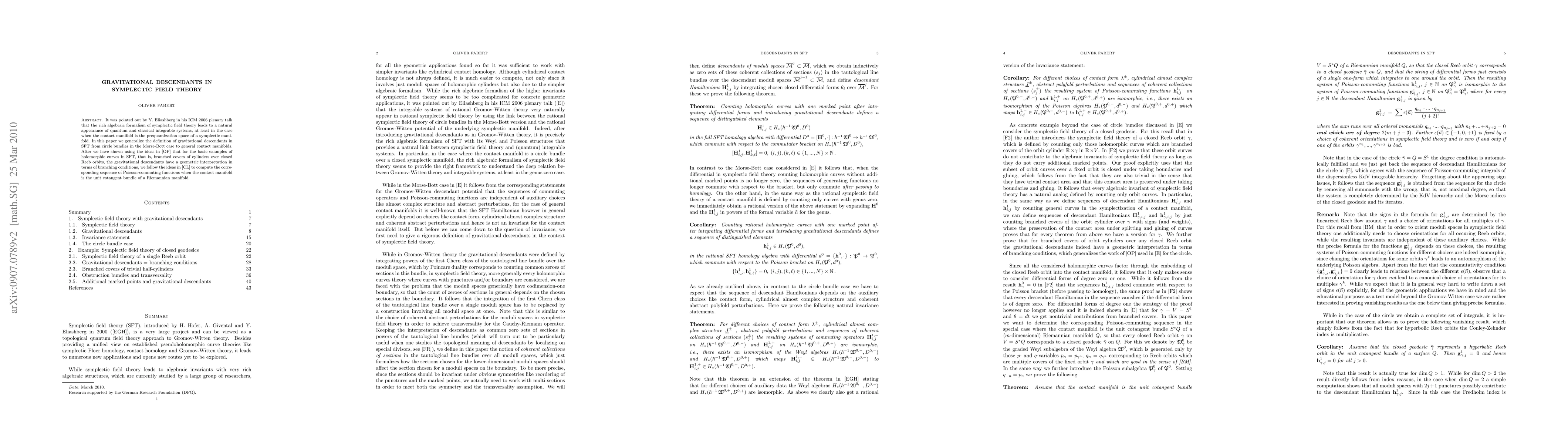 This paper generalizes the concept of gravitational descendants in symplectic field theory (SFT) from circle bundles to general contact manifolds, providing a geometric interpretation of these descendants in terms of branching conditions for holomorphic curves. It also computes sequences of Poisson-commuting functions for the unit cotangent bundle of a Riemannian manifold.