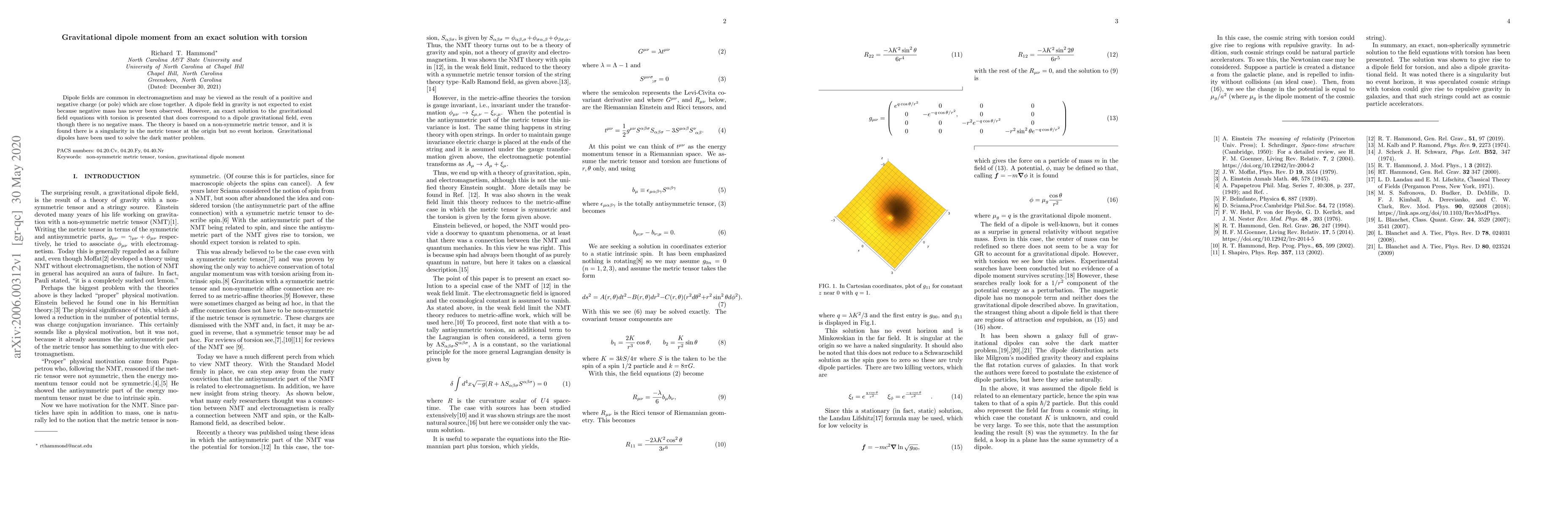 Dipole fields are common in electromagnetism and may be viewed as the result of a positive and negative charge (or pole) which are close together. A dipole field in gravity is not expected to exist because negative mass has never been observed. However, an exact solution to the gravitational field equations with torsion is presented that does correspond to a dipole gravitational field, even though there is no negative mass. The theory is based on a non-symmetric metric tensor, and it is found there is a singularity in the metric tensor at the origin but no event horizon. Gravitational dipoles have been used to solve the dark matter problem.