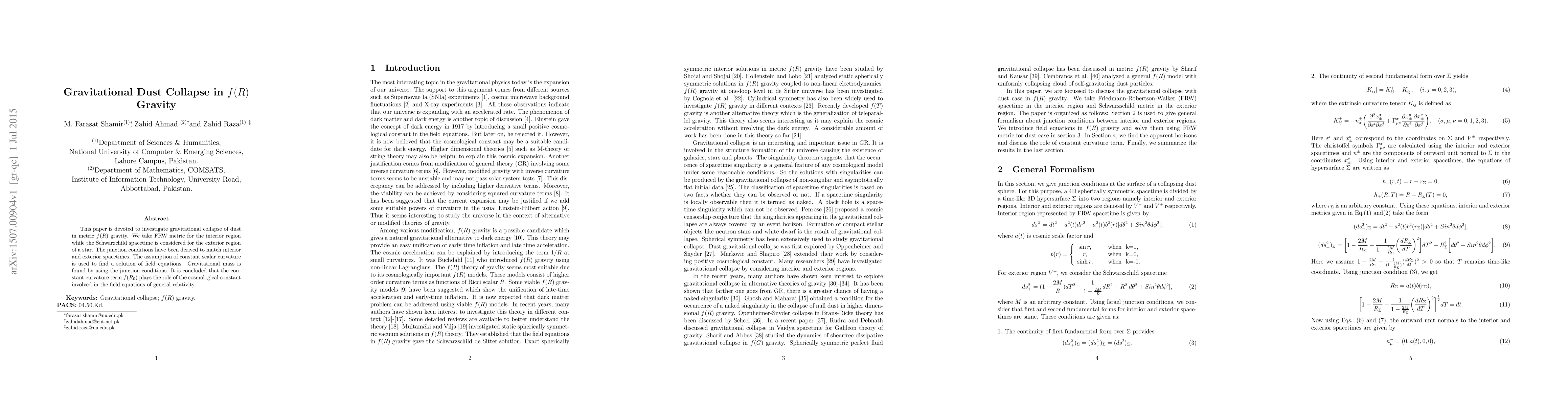 This paper explores the gravitational collapse of dust in $f(R)$ gravity, employing the FRW metric for the interior and Schwarzschild spacetime for the exterior of a star, and derives junction conditions to match the two regions. It concludes that the constant curvature term $f(R_0)$ functions as a cosmological constant in the field equations.