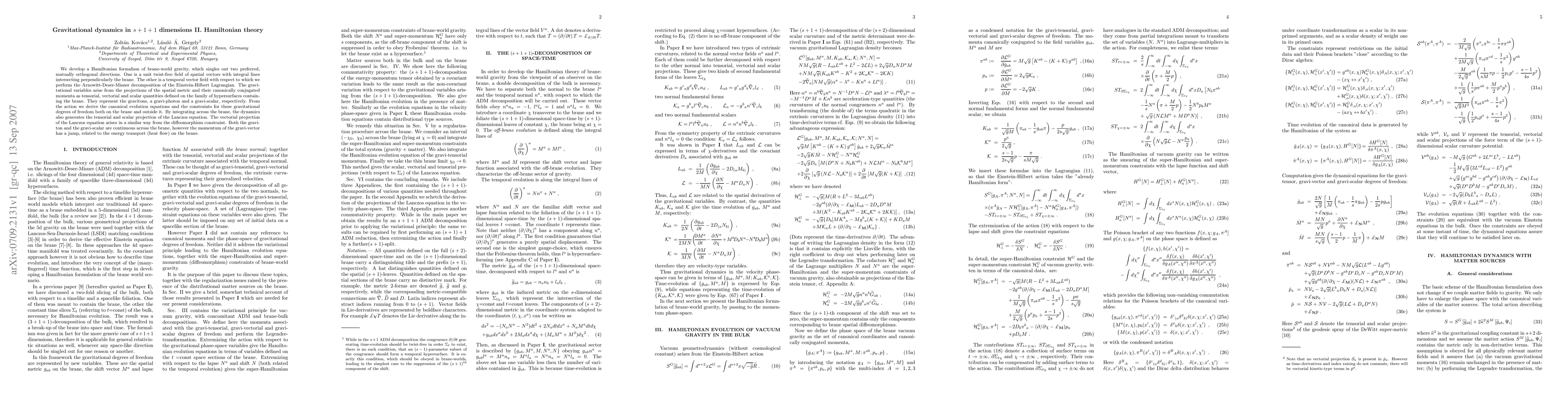 We develop a Hamiltonian formalism of brane-world gravity, which singles out two preferred, mutually orthogonal directions. One is a unit twist-free field of spatial vectors with integral lines intersecting perpendicularly the brane. The other is a temporal vector field with respect to which we perform the Arnowitt-Deser-Misner decomposition of the Einstein-Hilbert Lagrangian. The gravitational variables arise from the projections of the spatial metric and their canonically conjugated momenta as tensorial, vectorial and scalar quantities defined on the family of hypersurfaces containing the brane. They represent the gravitons, a gravi-photon and a gravi-scalar, respectively. From the action we derive the canonical evolution equations and the constraints for these gravitational degrees of freedom both on the brane and outside it. By integrating across the brane, the dynamics also generates the tensorial and scalar projection of the Lanczos equation. The vectorial projection of the Lanczos equation arises in a similar way from the diffeomorphism constraint. Both the graviton and the gravi-scalar are continuous across the brane, however the momentum of the gravi-vector has a jump, related to the energy transport (heat flow) on the brane.