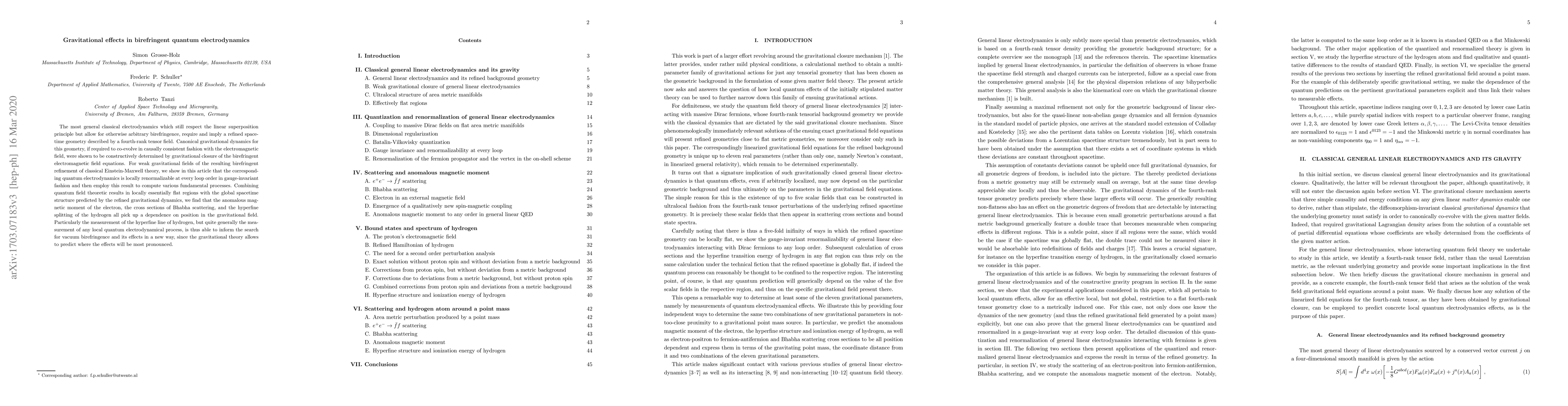 The most general classical electrodynamics which still respect the linear superposition principle but allow for otherwise arbitrary birefringence require, and imply, a refined spacetime geometry described by a fourth-rank tensor field. Canonical gravitational dynamics for this geometry, if required to co-evolve in causally consistent fashion with the electromagnetic field, were shown to be constructively determined by gravitational closure of the birefringent electromagnetic field equations. For weak gravitational fields of the resulting birefringent refinement of classical Einstein-Maxwell theory, we show in this article that the corresponding quantum electrodynamics is locally renormalizable at every loop order in gauge-invariant fashion and then employ this result to compute various fundamental processes. Combining quantum field theoretic results in locally essentially flat regions with the global spacetime structure predicted by the refined gravitational dynamics, we find that the anomalous magnetic moment of the electron, the cross sections of Bhabha scattering, and the hyperfine splitting of the hydrogen all pick up a dependence on position in the gravitational field. Particularly the measurement of the hyperfine line of hydrogen, but quite generally the measurement of any local quantum electrodynamical process, is thus able to inform the search for vacuum birefringence and its effects in a new way, since the gravitational theory allows to predict where the effects will be most pronounced.