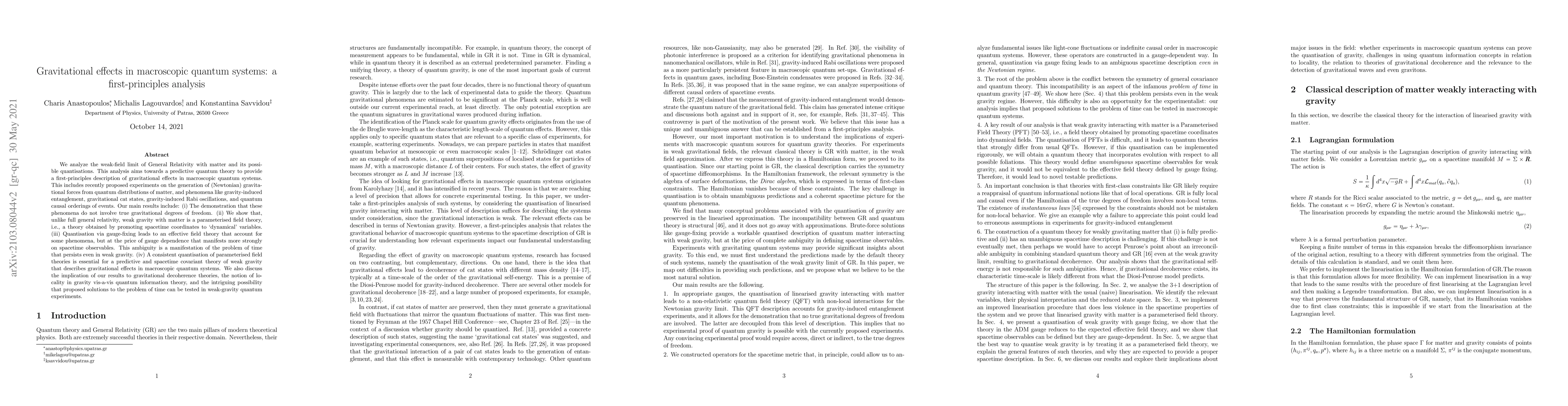 This paper investigates the weak-field limit of General Relativity in macroscopic quantum systems, demonstrating that phenomena like gravity-induced entanglement do not involve true gravitational degrees of freedom. It concludes that weak gravity is a parameterised field theory, and quantisation leads to gauge-dependent results, highlighting the persistent problem of time in weak gravity.