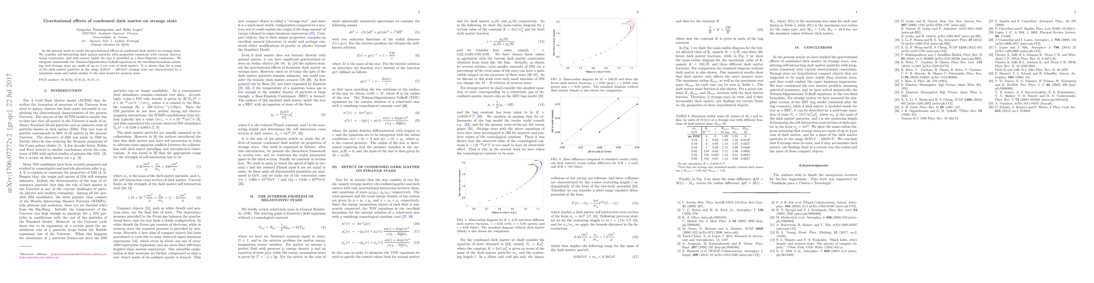 This paper investigates the gravitational impact of condensed dark matter on strange stars, modeling dark matter as a Bose-Einstein condensate and using the Tolman-Oppenheimer-Volkoff equations. It finds that strange stars with up to 4% dark matter maintain maximum mass and radius comparable to neutron stars when the dark matter particle mass ranges from 50 MeV to 160 MeV.