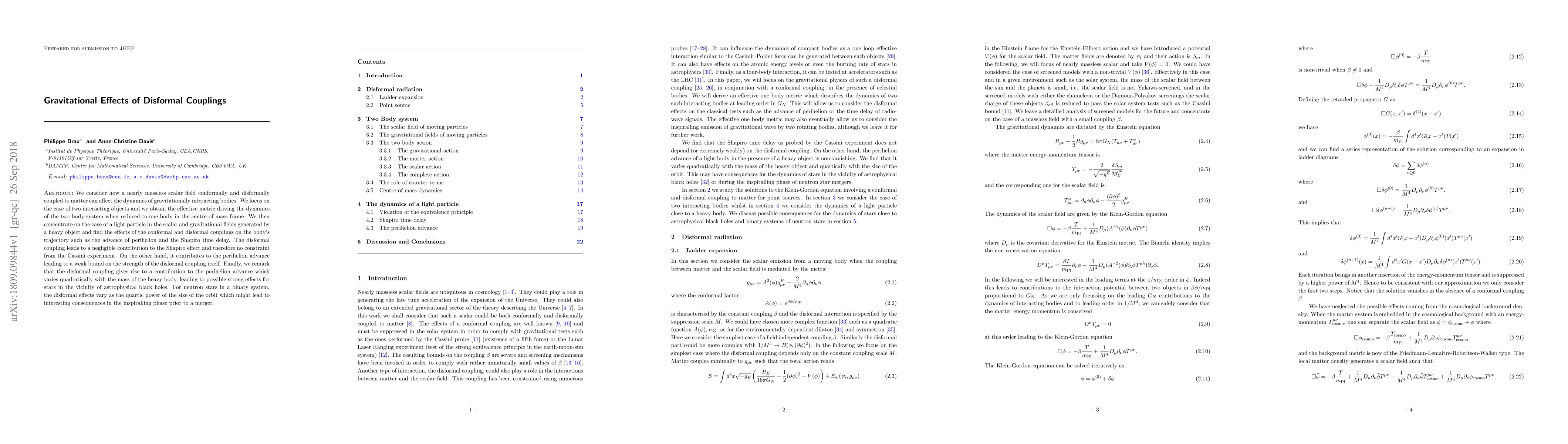 This paper investigates the gravitational effects of nearly massless scalar fields conformally and disformally coupled to matter, focusing on the dynamics of two interacting bodies. It finds that disformal coupling contributes to perihelion advance and leads to weak bounds on its strength, while having negligible effects on the Shapiro time delay.