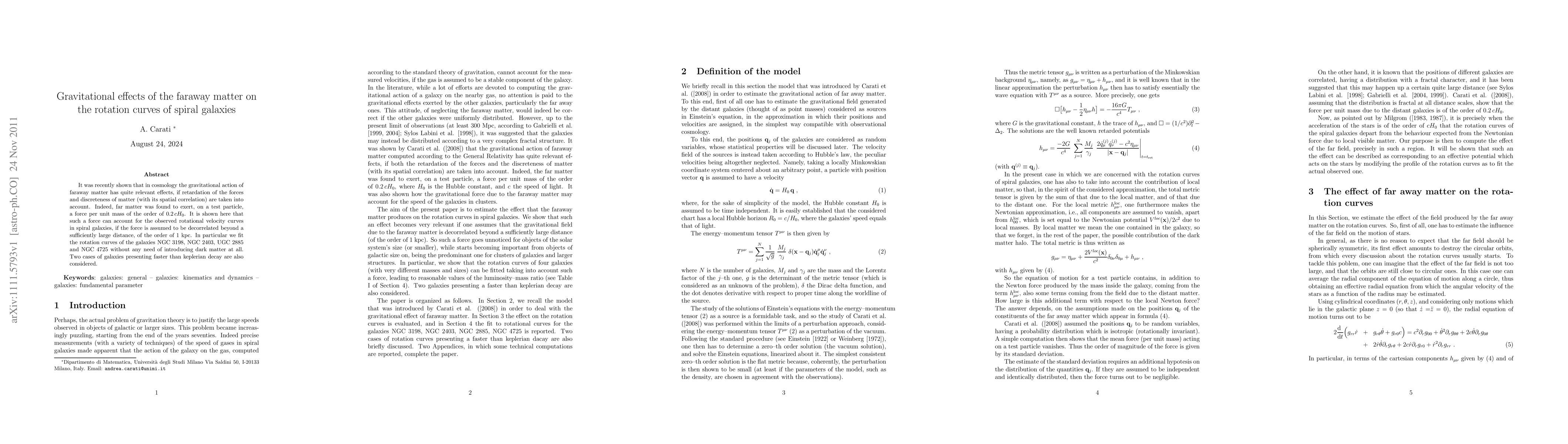 It was recently shown that in cosmology the gravitational action of faraway matter has quite relevant effects, if retardation of the forces and discreteness of matter (with its spatial correlation) are taken into account. Indeed, far matter was found to exert, on a test particle, a force per unit mass of the order of 0.2 cH0 . It is shown here that such a force can account for the observed rotational velocity curves in spiral galaxies, if the force is assumed to be decorrelated beyond a sufficiently large distance, of the order of 1 kpc. In particular we fit the rotation curves of the galaxies NGC 3198, NGC 2403, UGC 2885 and NGC 4725 without any need of introducing dark matter at all. Two cases of galaxies presenting faster than keplerian decay are also considered.