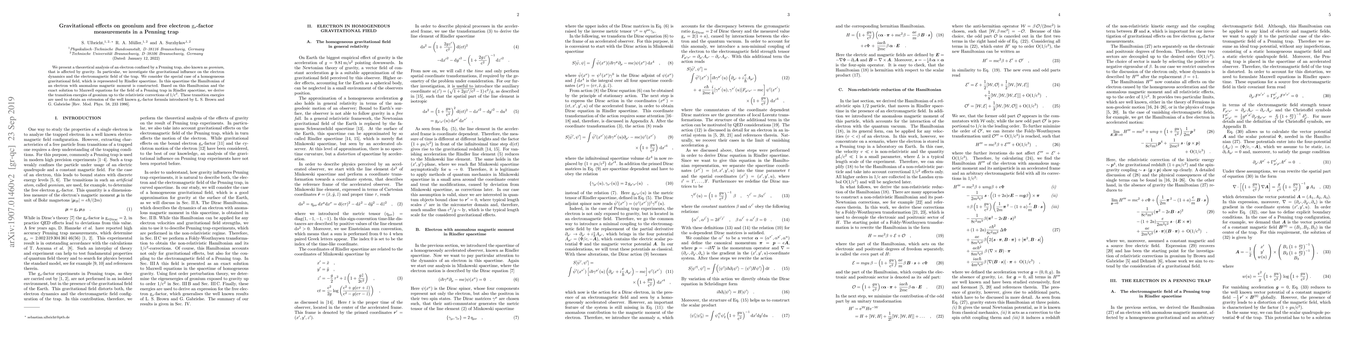 This paper analyzes the impact of gravity on electrons in a Penning trap (geonium), using Rindler spacetime to model a homogeneous gravitational field. The researchers derived geonium transition energies up to relativistic corrections, extending the g_s-factor formula.