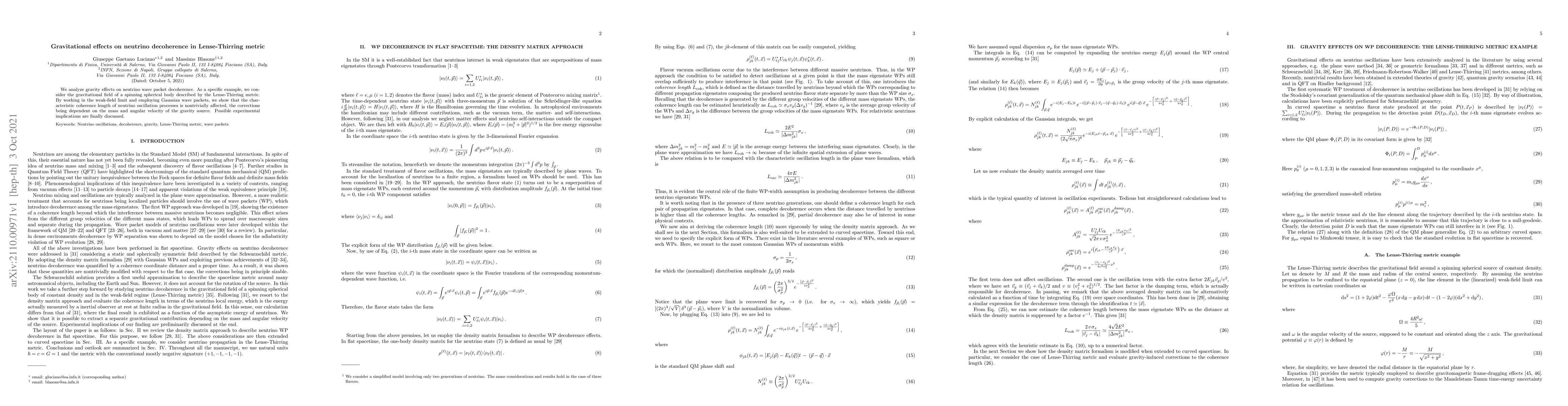 This paper investigates how gravitational effects, specifically those from a spinning spherical body described by the Lense-Thirring metric, influence neutrino decoherence. It demonstrates that the characteristic coherence length of neutrino oscillations is affected, with corrections dependent on the mass and angular velocity of the gravitational source, and discusses potential experimental implications.
