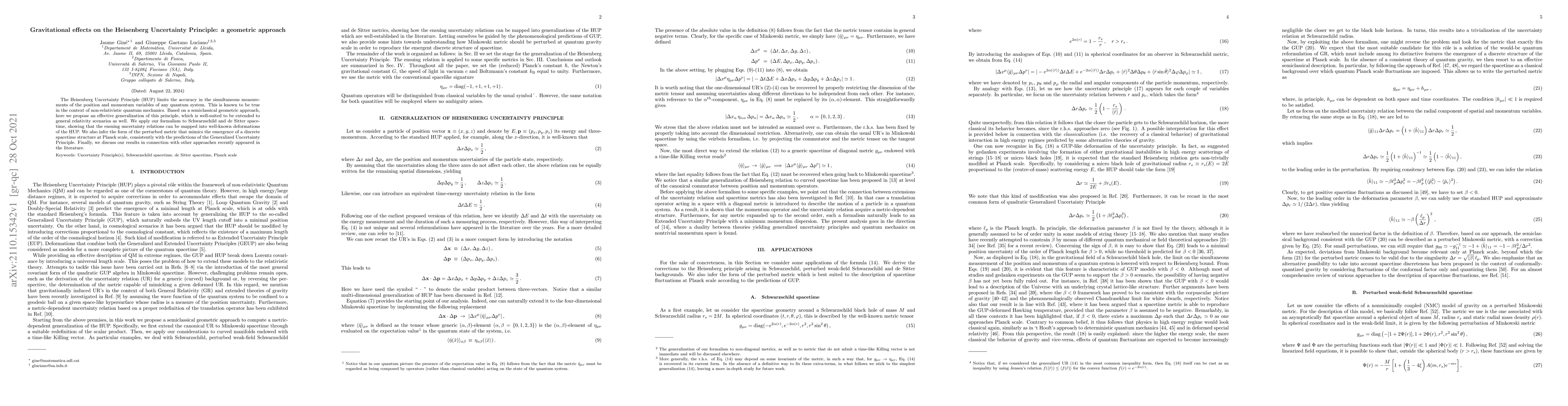 The Heisenberg Uncertainty Principle (HUP) limits the accuracy in the simultaneous measurements of the position and momentum variables of any quantum system. This is known to be true in the context of non-relativistic quantum mechanics. Based on a semiclassical geometric approach, here we propose an effective generalization of this principle, which is well-suited to be extended to general relativity scenarios as well. We apply our formalism to Schwarzschild and de Sitter space-time, showing that the ensuing uncertainty relations can be mapped into well-known deformations of the HUP. We also infer the form of the perturbed metric that mimics the emergence of a discrete spacetime structure at Planck scale, consistently with the predictions of the Generalized Uncertainty Principle. Finally, we discuss our results in connection with other approaches recently appeared in the literature.