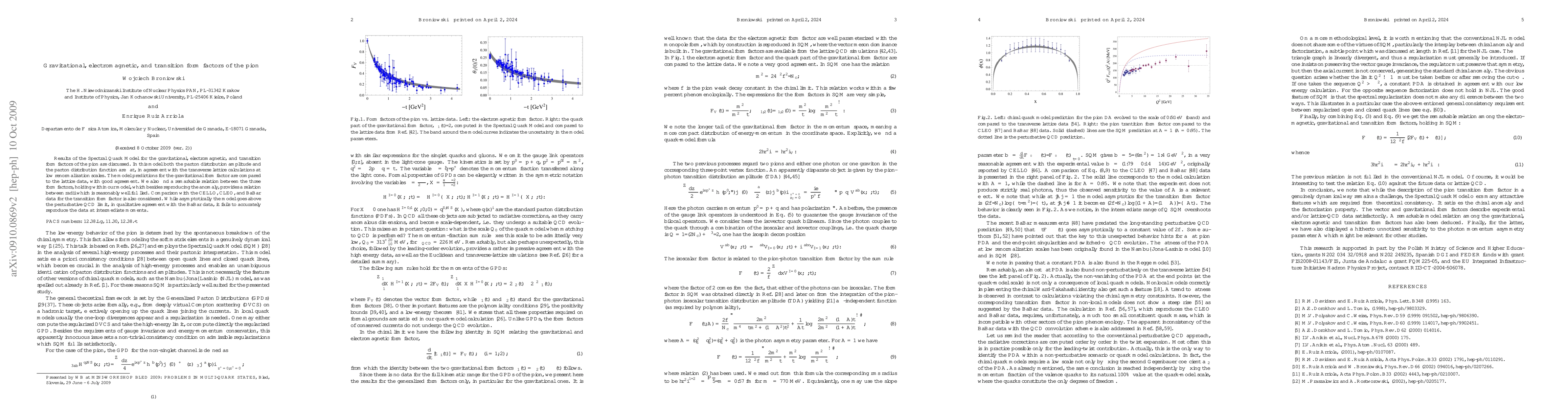 Results of the Spectral Quark Model for the gravitational, electromagnetic, and transition form factors of the pion are discussed. In this model both the parton distribution amplitude and the parton distribution function are flat, in agreement with the transverse lattice calculations at low renormalization scales. The model predictions for the gravitational form factor are compared to the lattice data, with good agreement. We also find a remarkable relation between the three form factors, holding within our model, which besides reproducing the anomaly, provides a relation between radii which is reasonably well fulfilled. Comparison with the CELLO, CLEO, and BaBar data for the transition form factor is also considered.