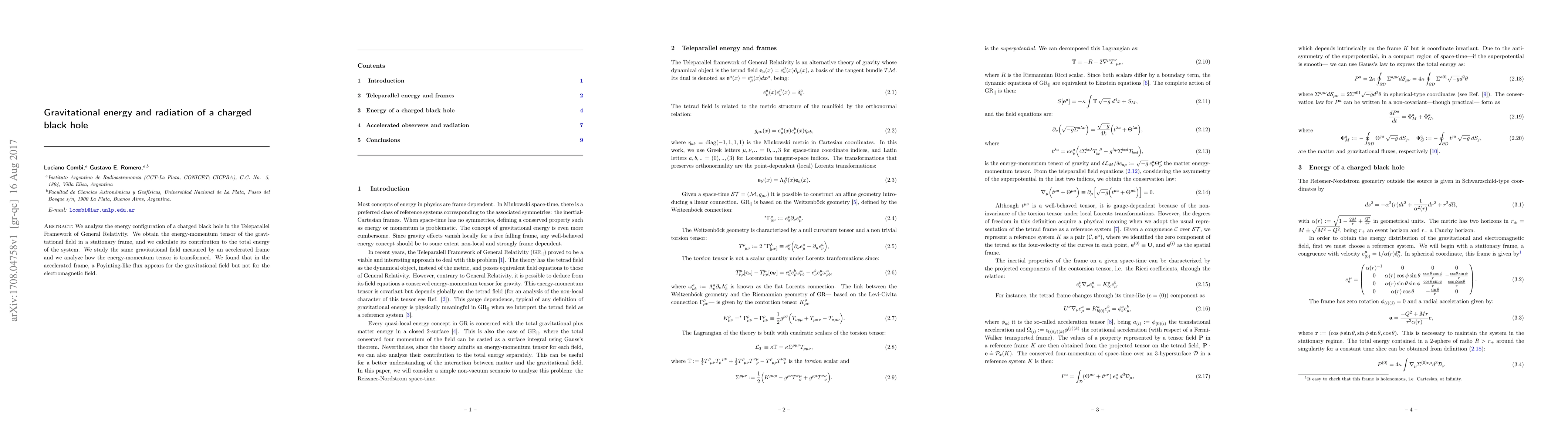We analyze the energy configuration of a charged black hole in the Teleparallel Framework of General Relativity. We obtain the energy-momentum tensor of the gravitational field in a stationary frame, and we calculate its contribution to the total energy of the system. We study the same gravitational field measured by an accelerated frame and we analyze how the energy-momentum tensor is transformed. We found that in the accelerated frame, a Poyinting-like flux appears for the gravitational field but not for the electromagnetic field.