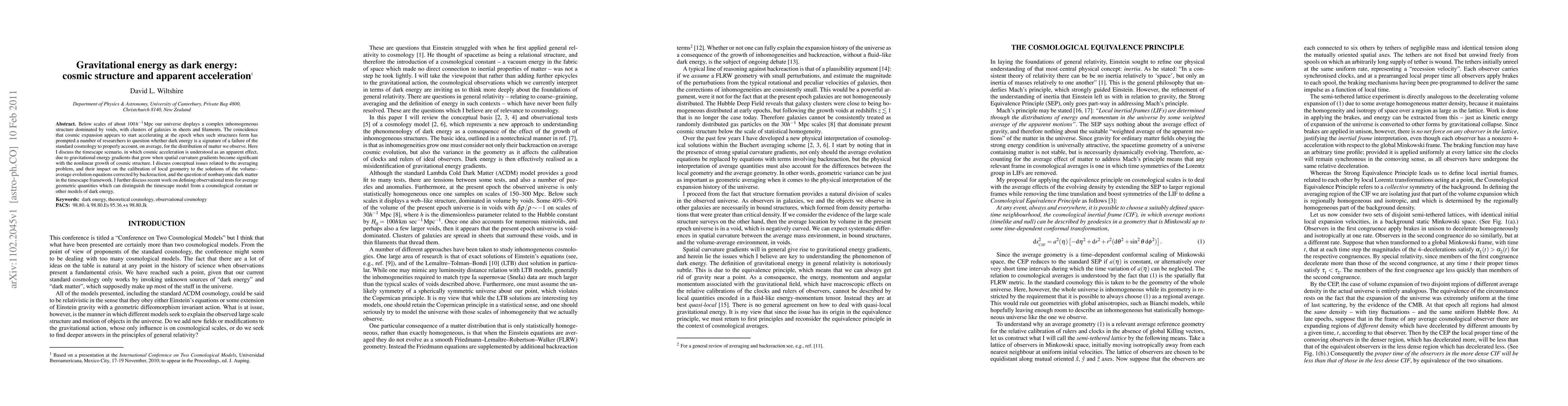 This paper explores the timescape scenario where cosmic acceleration is an apparent effect caused by gravitational energy gradients due to the nonlinear growth of cosmic structures. It discusses the implications for the averaging problem and the potential distinction from dark energy models through observational tests.