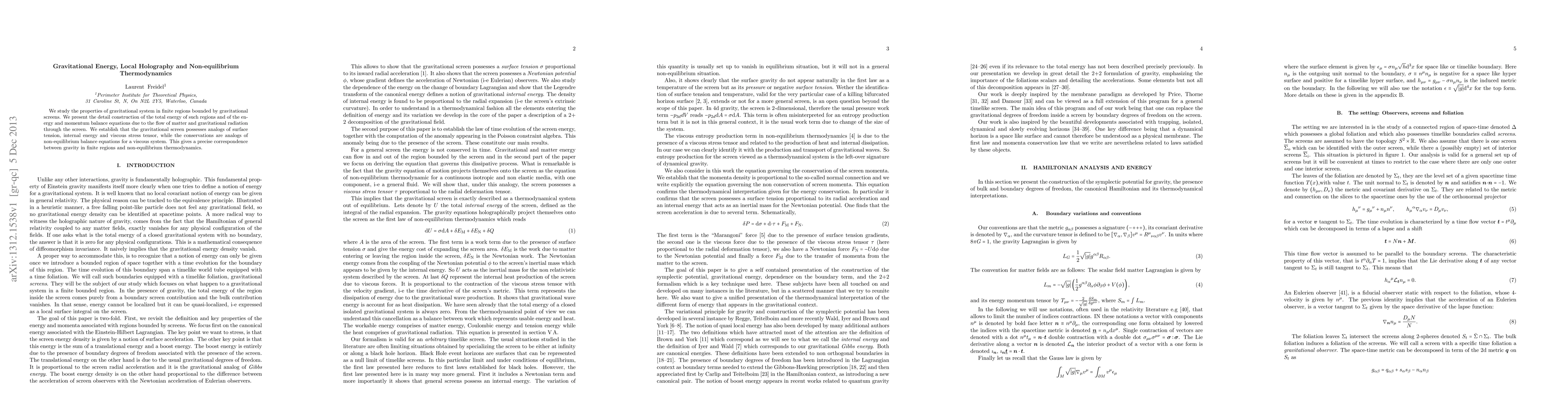 We study the properties of gravitational system in finite regions bounded by gravitational screens. We present the detail construction of the total energy of such regions and of the energy and momentum balance equations due to the flow of matter and gravitational radiation through the screen. We establish that the gravitational screen possesses analogs of surface tension, internal energy and viscous stress tensor, while the conservations are analogs of non-equilibrium balance equations for a viscous system. This gives a precise correspondence between gravity in finite regions and non-equilibrium thermodynamics.