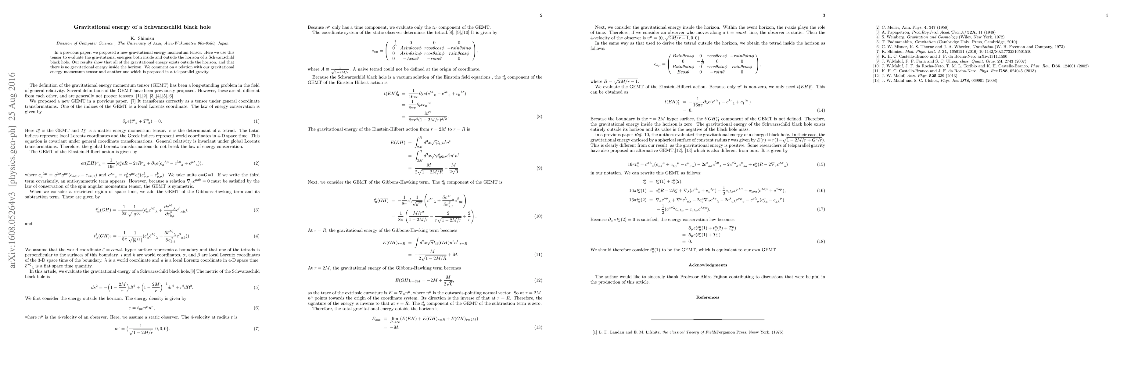 This paper evaluates gravitational energy in a Schwarzschild black hole using a newly proposed gravitational energy-momentum tensor, revealing that all gravitational energy resides outside the event horizon, with none present inside. The study also discusses its relation to a tensor from teleparallel gravity.