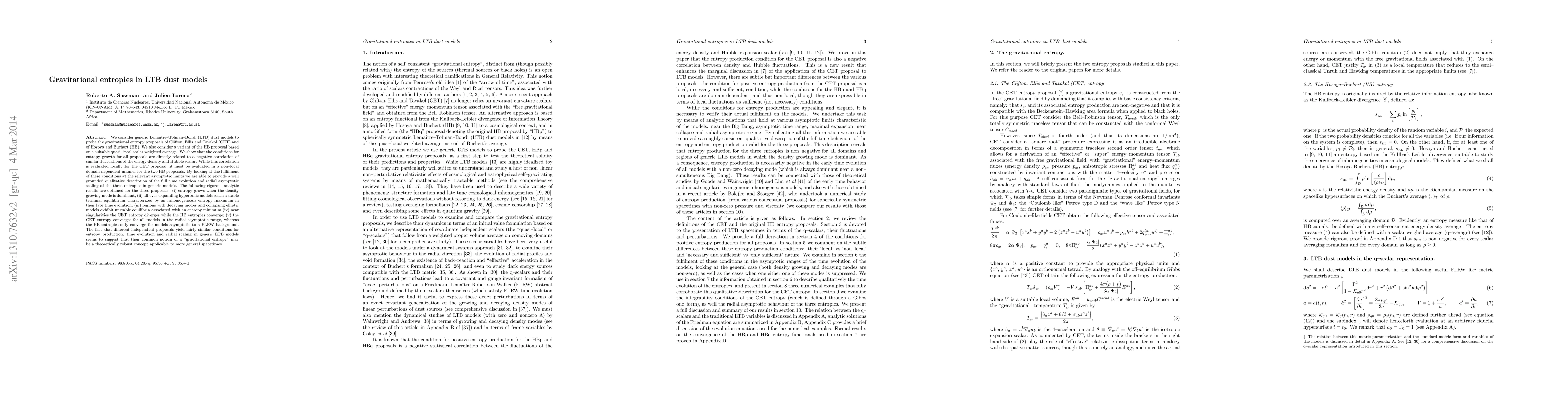 We consider generic Lemaitre-Tolman-Bondi (LTB) dust models to probe the gravitational entropy proposals of Clifton, Ellis and Tavakol (CET) and of Hosoya and Buchert (HB). We also consider a variant of the HB proposal based on a suitable quasi-local scalar weighted average. We show that the conditions for entropy growth for all proposals are directly related to a negative correlation of similar fluctuations of the energy density and Hubble scalar. While this correlation is evaluated locally for the CET proposal, it must be evaluated in a non--local domain dependent manner for the two HB proposals. By looking at the fulfillment of these conditions at the relevant asymptotic limits we are able to provide a well grounded qualitative description of the full time evolution and radial asymptotic scaling of the three entropies in generic models. The following rigorous analytic results are obtained for the three proposals: (i) entropy grows when the density growing mode is dominant, (ii) all ever-expanding hyperbolic models reach a stable terminal equilibrium characterized by an inhomogeneous entropy maximum in their late time evolution; (iii) regions with decaying modes and collapsing elliptic models exhibit unstable equilibria associated with an entropy minimum (iv) near singularities the CET entropy diverges while the HB entropies converge; (v) the CET entropy converges for all models in the radial asymptotic range, whereas the HB entropies only converge for models asymptotic to an FLRW background. The fact that different independent proposals yield fairly similar conditions for entropy production, time evolution and radial scaling in generic LTB models seems to suggest that their common notion of a "gravitational entropy" may be a theoretically robust concept applicable to more general spacetimes.