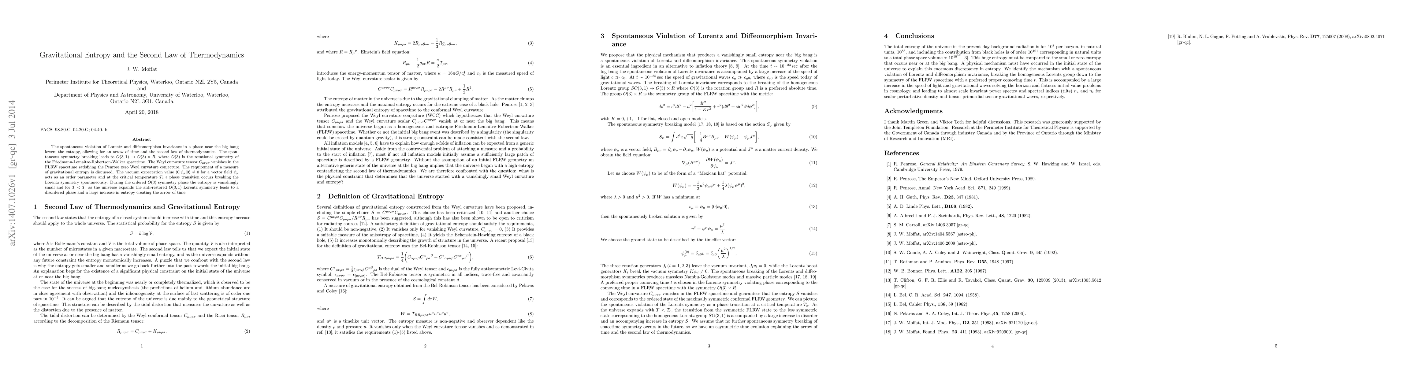 The spontaneous violation of Lorentz and diffeomorphism invariance in a phase near the big bang lowers the entropy, allowing for an arrow of time and the second law of thermodynamics. The spontaneous symmetry breaking leads to $O(3,1)\rightarrow O(3)\times R$, where $O(3)$ is the rotational symmetry of the Friedmann-Lema\^{i}tre-Robertson-Walker spacetime. The Weyl curvature tensor $C_{\mu\nu\rho\sigma}$ vanishes in the FLRW spacetime satisfying the Penrose zero Weyl curvature conjecture. The requirement of a measure of gravitational entropy is discussed. The vacuum expectation value $\langle 0\vert\psi_\mu\vert 0\rangle\neq 0$ for a vector field $\psi_\mu$ acts as an order parameter and at the critical temperature $T_c$ a phase transition occurs breaking the Lorentz symmetry spontaneously. During the ordered $O(3)$ symmetry phase the entropy is vanishingly small and for $T < T_c$ as the universe expands the anti-restored $O(3,1)$ Lorentz symmetry leads to a disordered phase and a large increase in entropy creating the arrow of time.