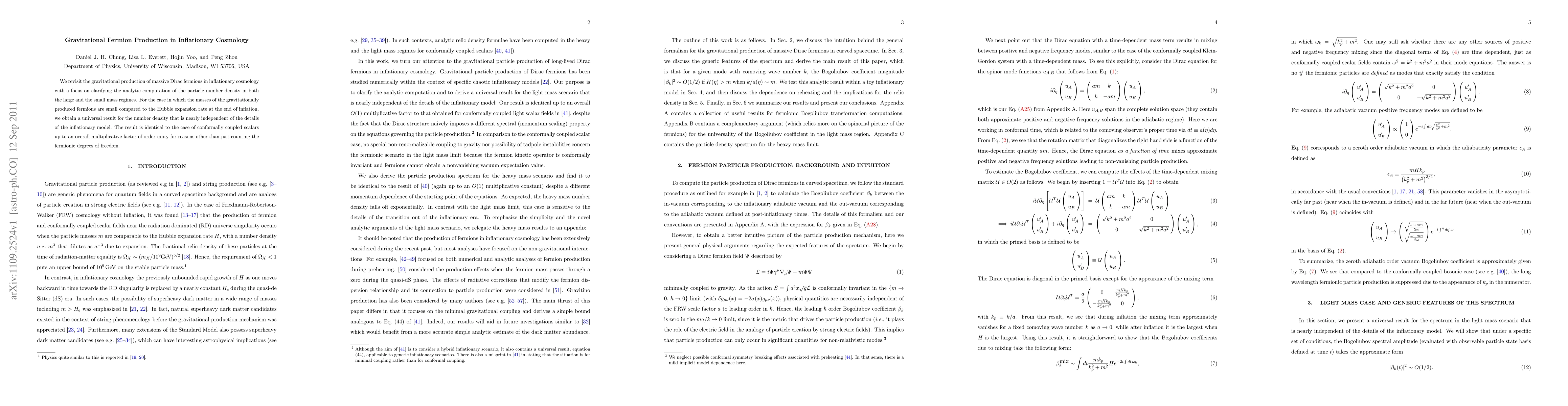 We revisit the gravitational production of massive Dirac fermions in inflationary cosmology with a focus on clarifying the analytic computation of the particle number density in both the large and the small mass regimes. For the case in which the masses of the gravitationally produced fermions are small compared to the Hubble expansion rate at the end of inflation, we obtain a universal result for the number density that is nearly independent of the details of the inflationary model. The result is identical to the case of conformally coupled scalars up to an overall multiplicative factor of order unity for reasons other than just counting the fermionic degrees of freedom.