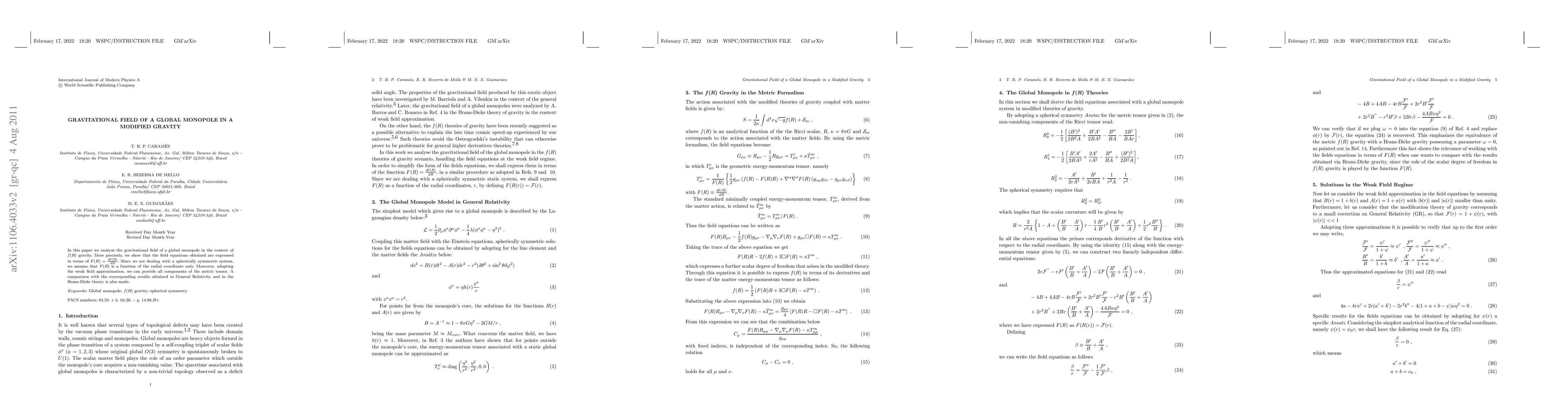 In this paper we analyze the gravitational field of a global monopole in the context of $f(R)$ gravity. More precisely, we show that the field equations obtained are expressed in terms of $F(R)=\frac{df(R)}{dR}$. Since we are dealing with a spherically symmetric system, we assume that $F(R)$ is a function of the radial coordinate only. Moreover, adopting the weak field approximation, we can provide all components of the metric tensor. A comparison with the corresponding results obtained in General Relativity and in the Brans-Dicke theory is also made.