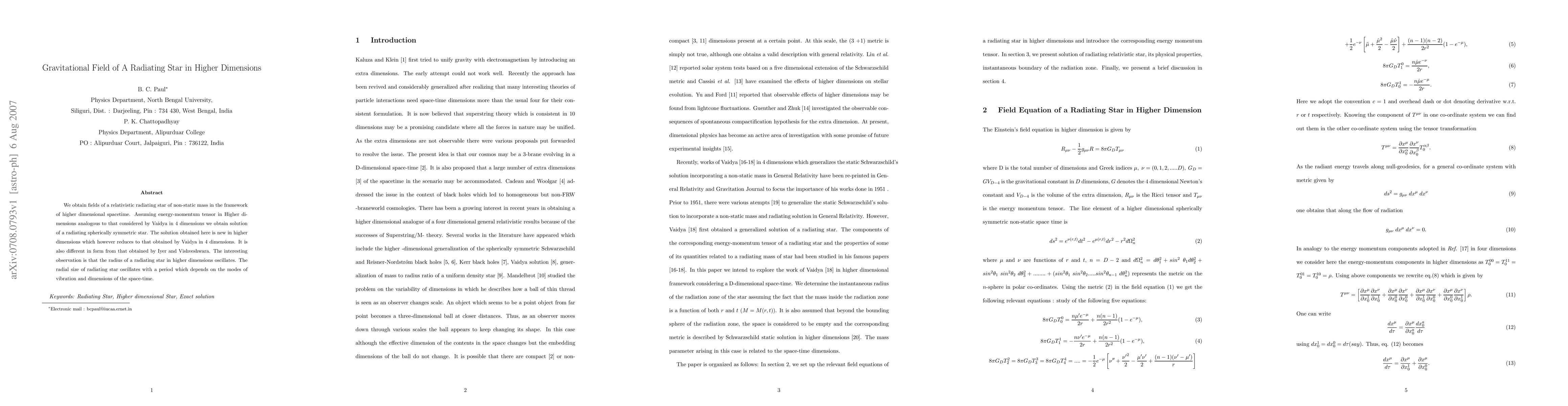 This paper presents a new solution for the gravitational field of a radiating star in higher-dimensional spacetime, analogous to Vaidya's 4-dimensional model. The solution reveals that the star's radius oscillates, with the oscillation period dependent on the spacetime dimensions and vibration modes.
