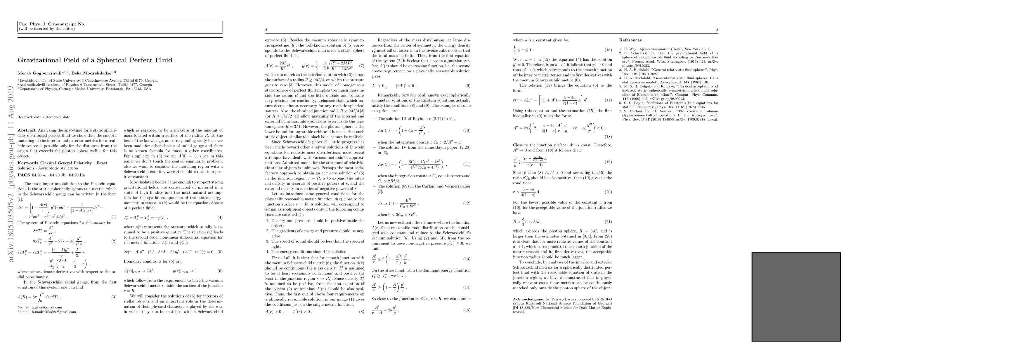 Analyzing the spacetime for a static spherically distributed perfect fluid we show that the smooth matching of the interior and exterior metrics for a realistic source is possible only for the distances from the origin that exceeds the photon sphere radius for this object.