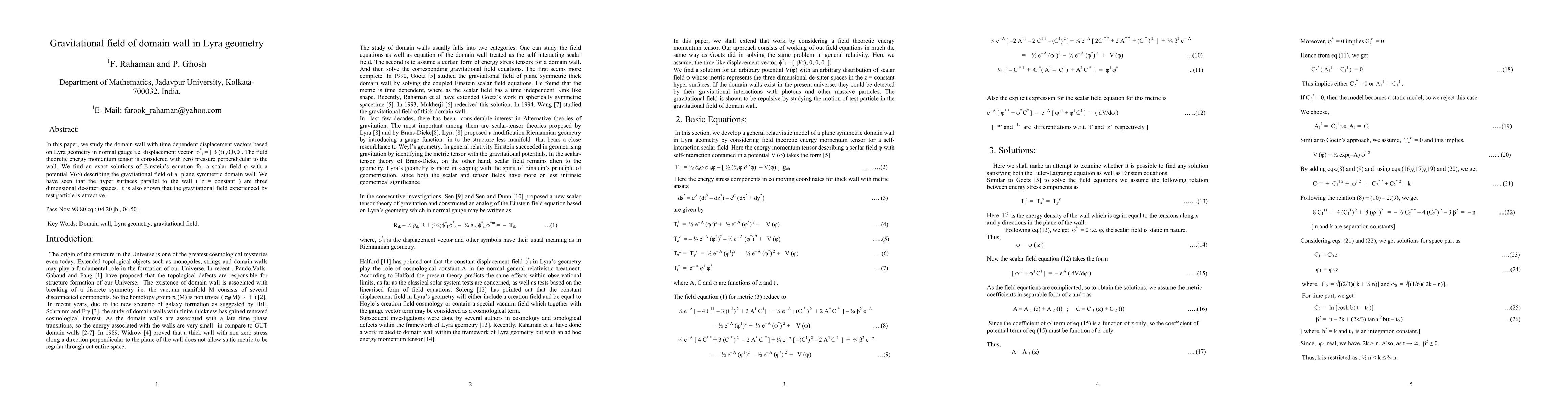 This paper investigates a domain wall in Lyra geometry with a time-dependent displacement vector, finding exact solutions for the gravitational field generated by a scalar field with a specific potential. The analysis reveals that the gravitational field is attractive and that hypersurfaces parallel to the wall are three-dimensional de-Sitter spaces.